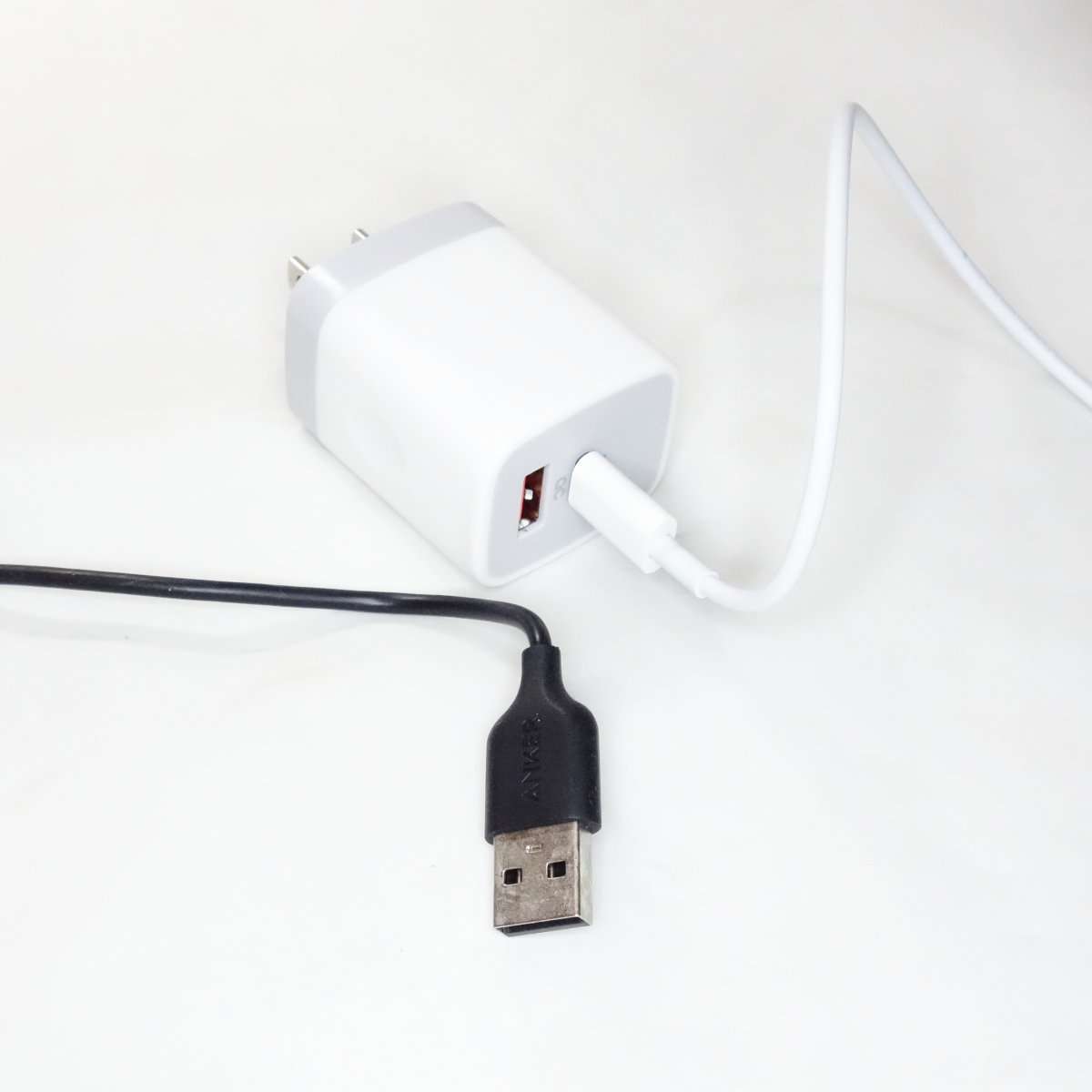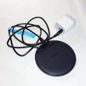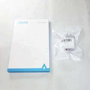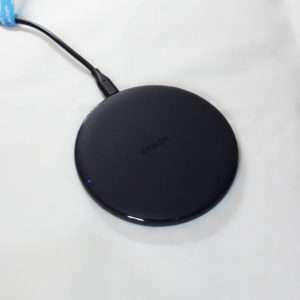 Ankerのワイヤレス充電器は本体とマイクロUSBのみのシンプルな構成です。ACアダプターは付属しないので、QC 3.0/2.0対応しているアダプターを別途用意するか現在使われているアダプターが対応しているか調べてみましょう。