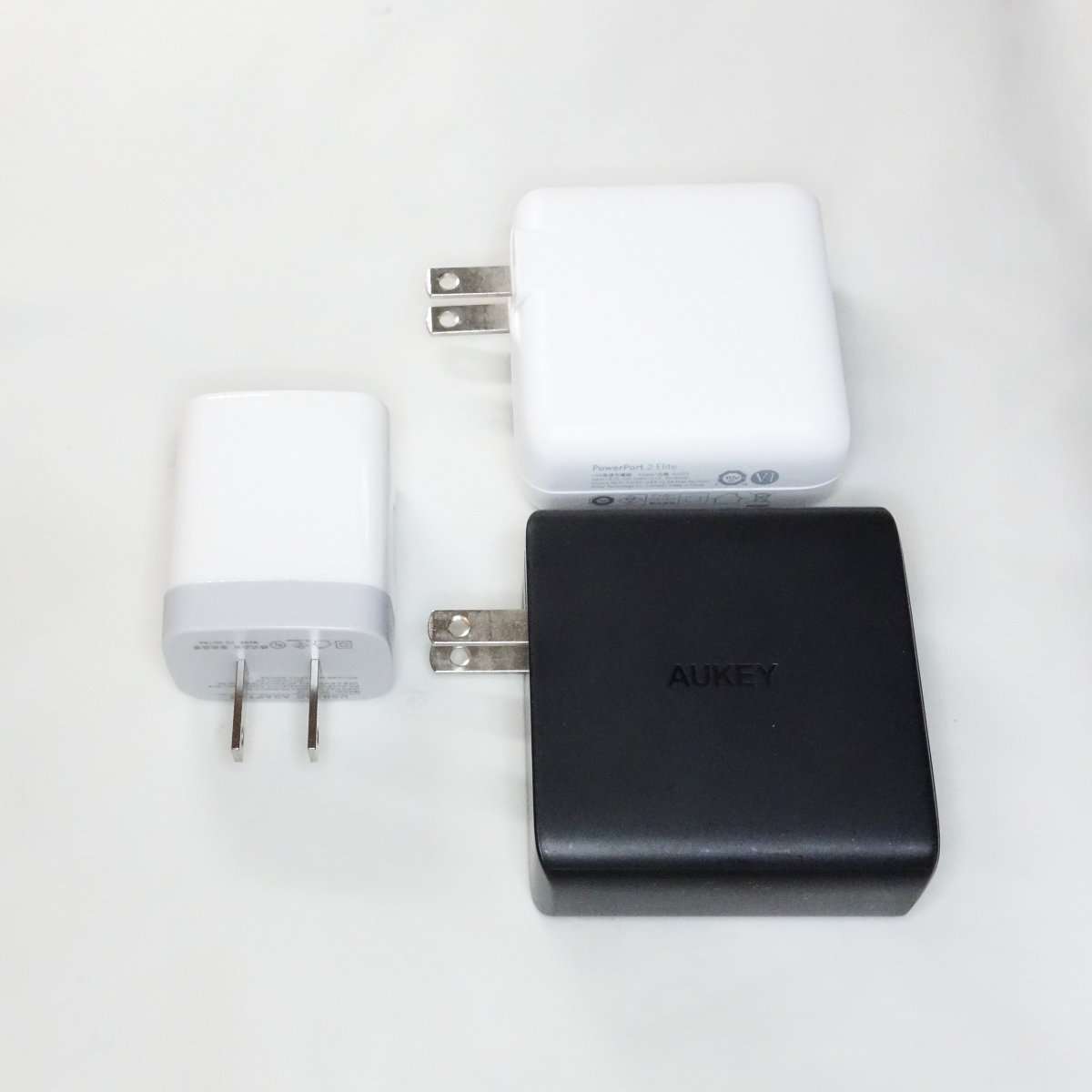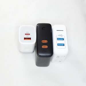 QC充電器はスマホの付属充電器のようなサイズなのでAnkerのUSB-A充電器とAukeyのUSB-C充電器と比べてみるとかなりコンパクトです。