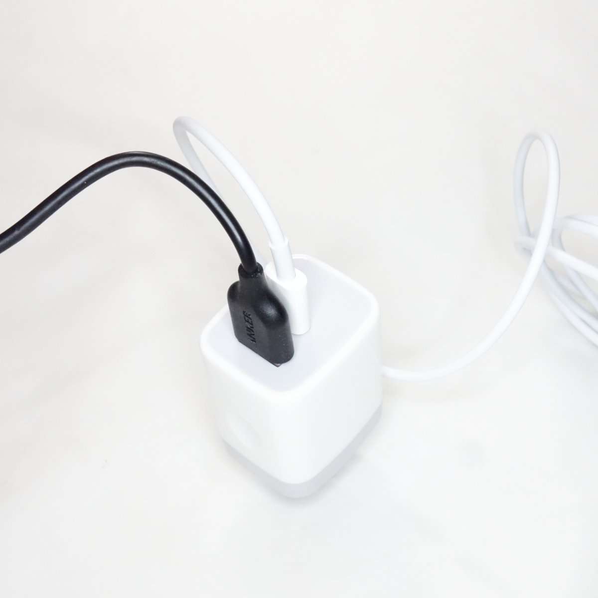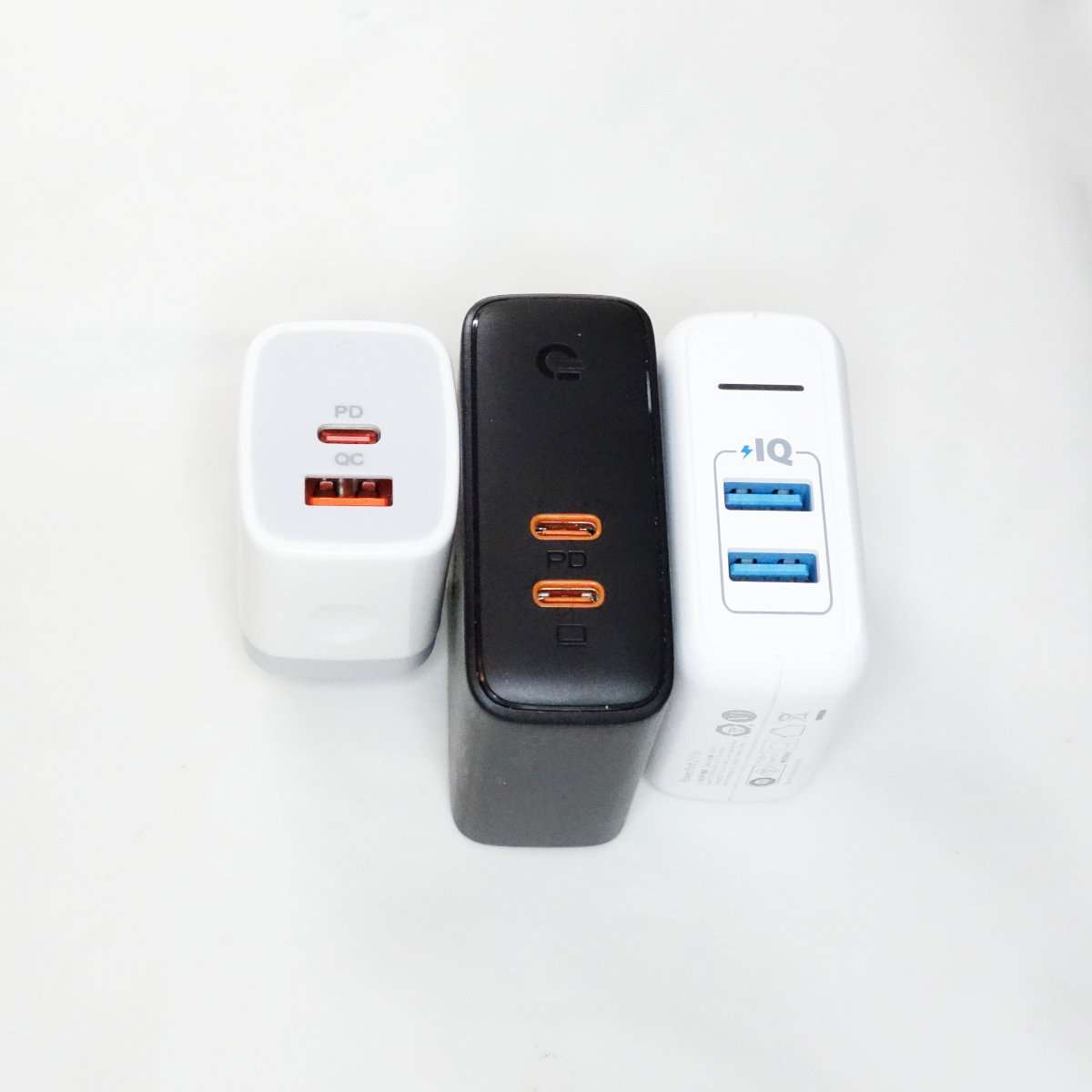 右の白い方がAnker IQ充電器で黒い方がAukey PD充電器です