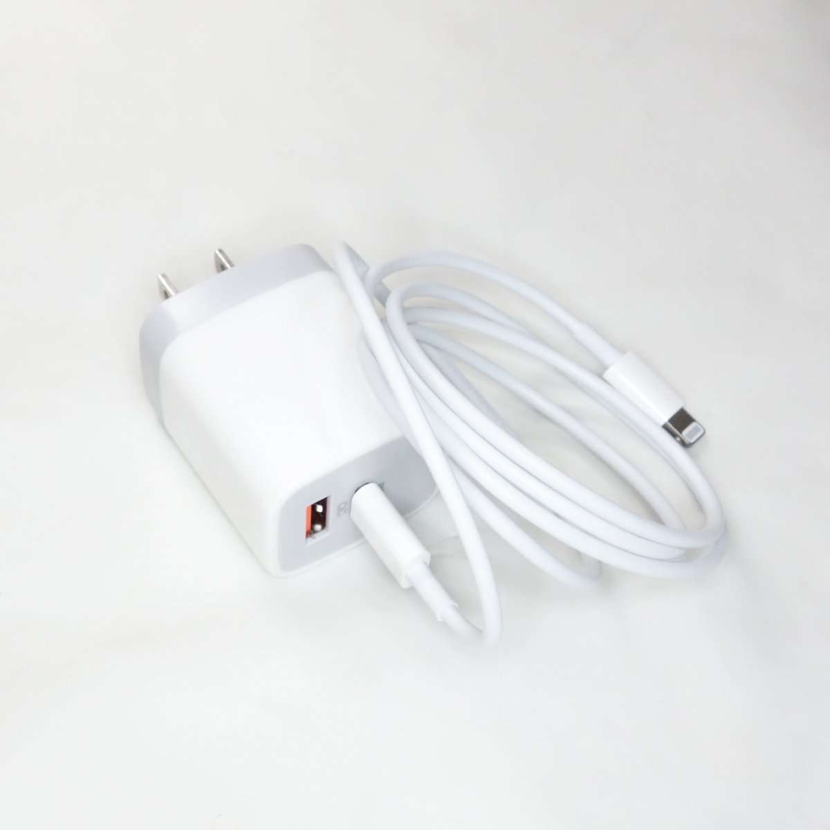 QC充電器にはUSB-Aに加えてUSB-Cにも対応しているので、USB-CにLightningケーブルを接続する事にしました。iPhone XS Maxに付属していたApple純正USB-C to Lightningケーブルをそのまま使用する事にしました。