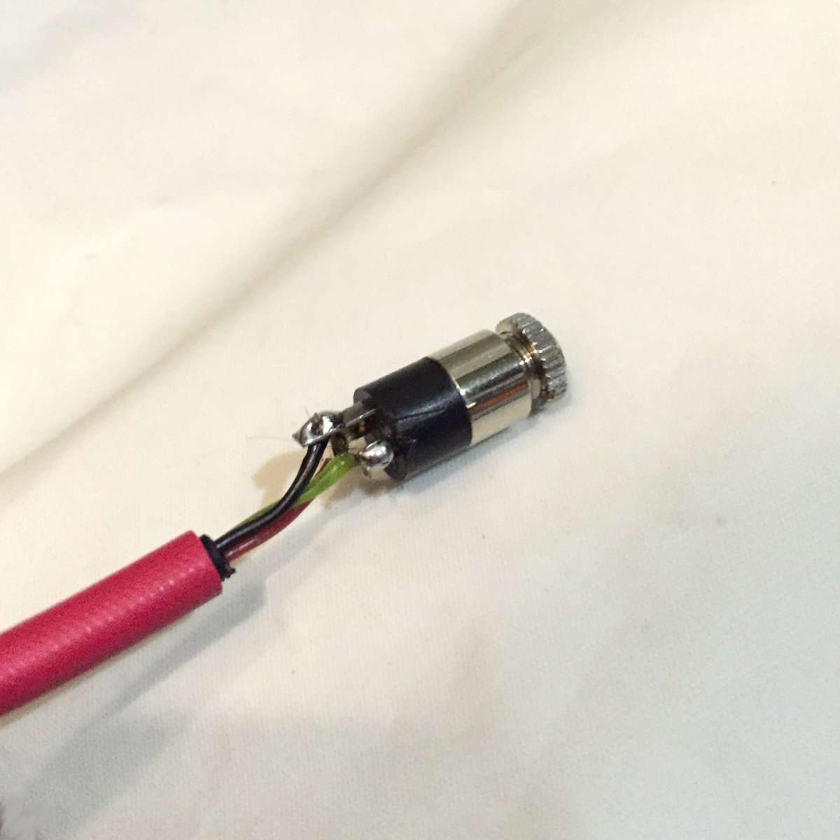 ●ヘッドホン側で切ったケーブルにジャックを半田づけします。先に熱圧縮チューブを入れるのを忘れずLRとコールド(アース)の向きなどを間違えないように半田づけしましょう。このヘッドホンの場合は赤がR、緑がL、黒がコールド(アース)のはずです。ここで接続して組み立てる前に音が出るか確認、無事2つのケーブルとも音が出ました。
