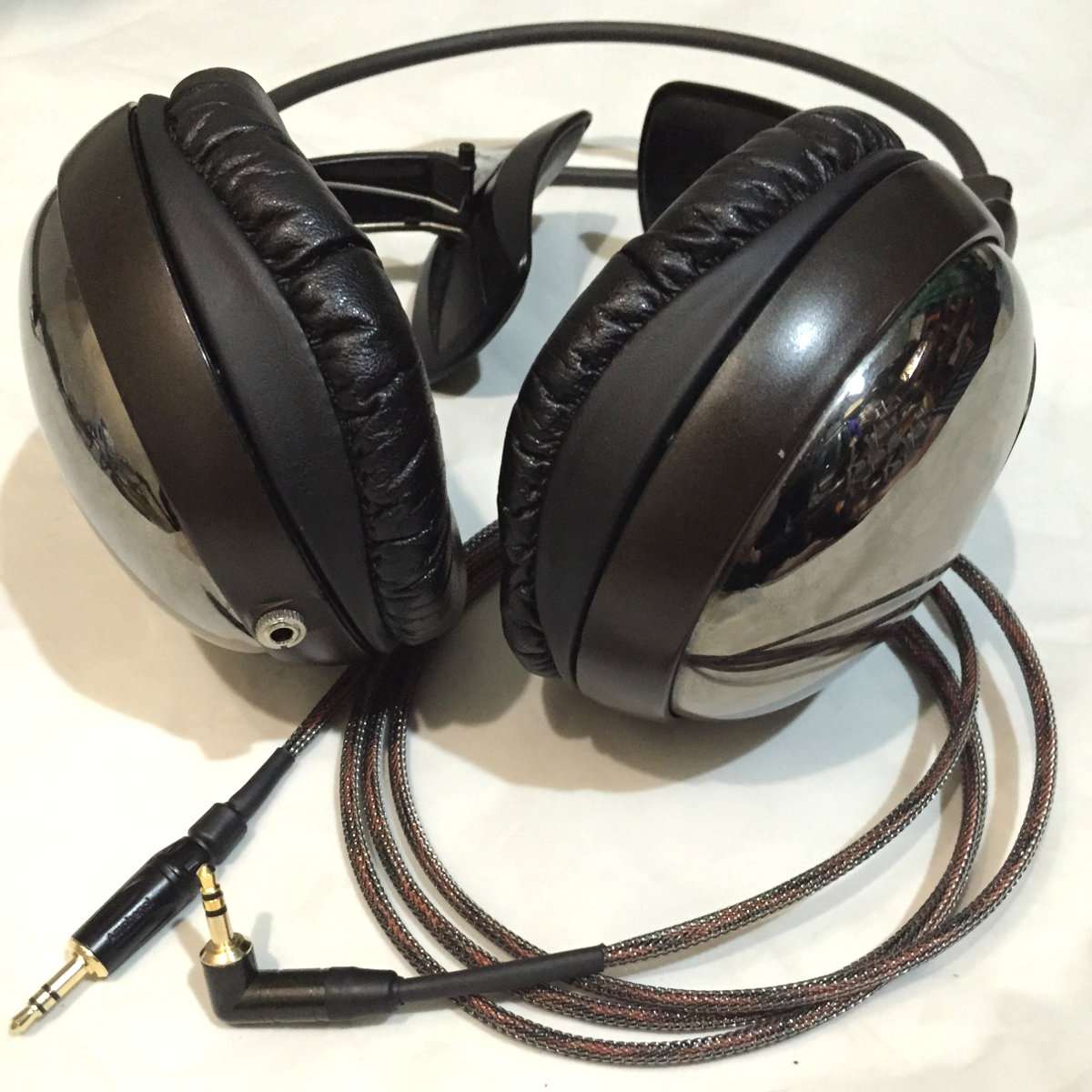 実際に今回新しく作ったメッシュケーブルを取り付けてみました。音も前より落ち着いた感じで昔の銀線のような軽い音は一切せずまた同じ銀線でケーブルを作ってもいいかと思わせる出来です。それにくわえてグラスウール的チューンが効いたのか音の暴れも少なくなりいい感じです。ケーブルが1.5メートルになったので元々付いていた3メートルのケーブルより圧倒的に取り回しがよく、気軽に携帯オーディオプレーヤーなどで使用できるようになりました。メッシュチューブはケーブル自体が硬めになりますが、私は見た目がかなりよくなりとても気に入っています。メッシュチューブの一番の良さは見た目だけでなく、ケーブル自体がまず絡む事がなく使いやすくなる事です。ケーブル自体も短くなっているので、使う度に絡んでいるケーブルをほどく必要がなくなりました。元々ヘッドホンに付いていたケーブルはさすがのメーカー製らしくケーブル自体に高級感があるので、壊れていたプラグもL字プラグに替え断線しないよう処理もしたのでこちらのケーブルもこれからかなり長い間使えるはずです。