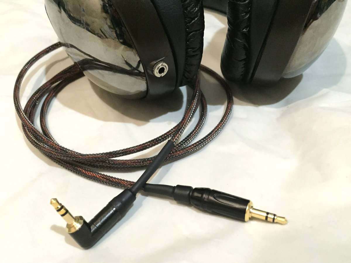 ●今回製作したL字プラグの1.5メートルのメッシュケーブルとリケーブル対応にしたヘッドホン本体。ケーブル自体を曲げると中のオレンジと黒が見えて格好いいです。この辺はお好みの色で好きな色を使うと面白いと思います。