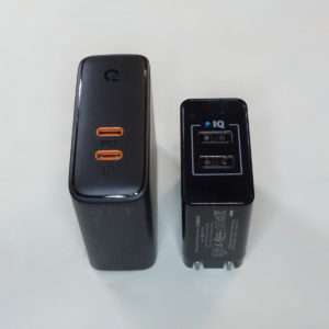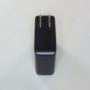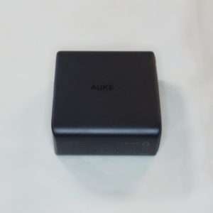 本体はブラックで素材は同じAukeyのモバイルバッテリーと同様のサラサラした素材で、作りも質感もよくAnker などと大差ありません。サイズは67 x 64x 29mmで重量は148gで同じAukeyか2ポート出力でこれより小型のモデルが出ていますが出力は36Wで、こちらはより高出力の63Wのモデルになります。家庭用でUSB-CとPD対応で家やオフィスで使用するなら63Wモデルにして、旅行用などでなるべく軽くコンパクトのにした方は36Wモデルを選ぶとよいかもしれません。