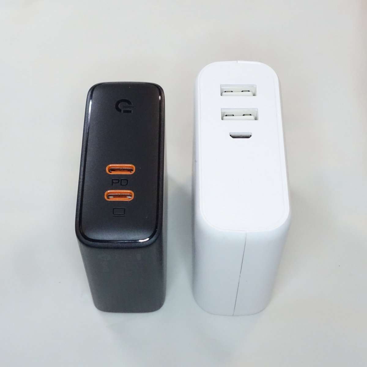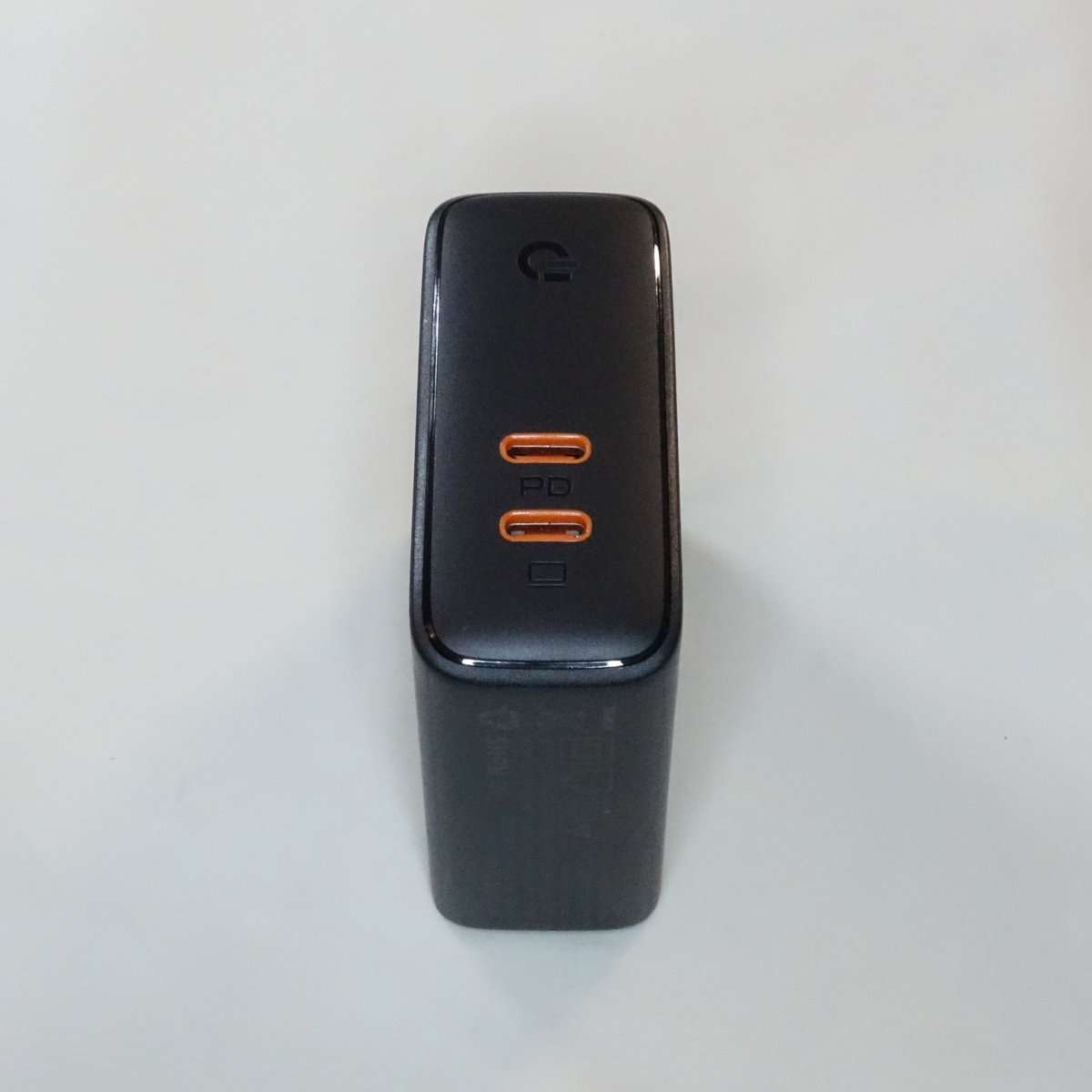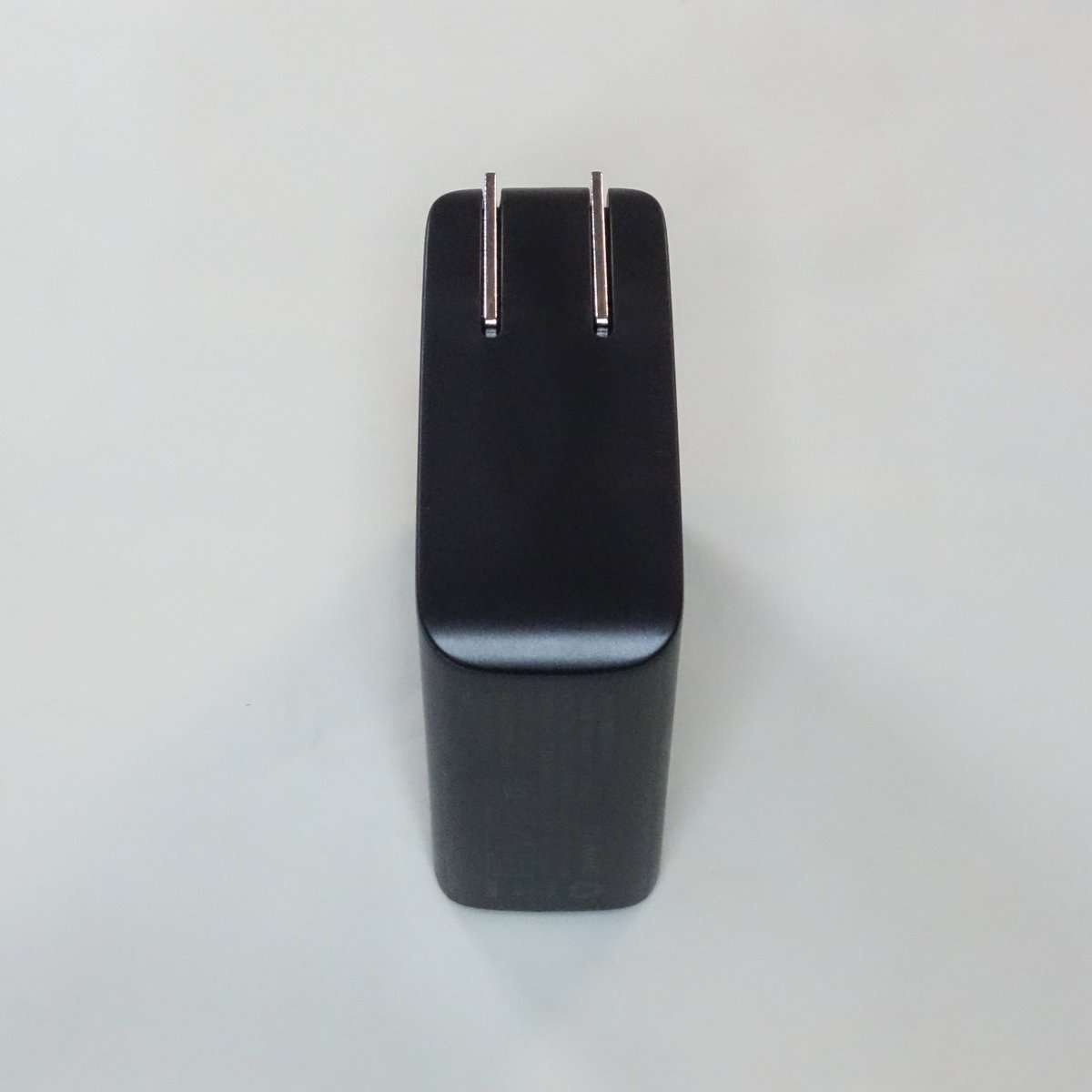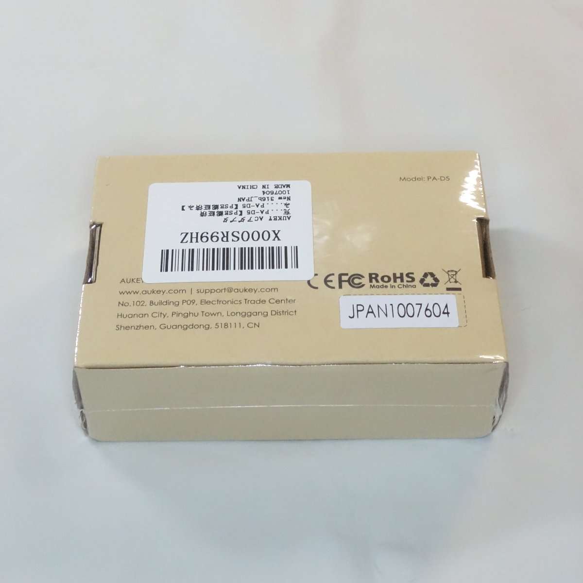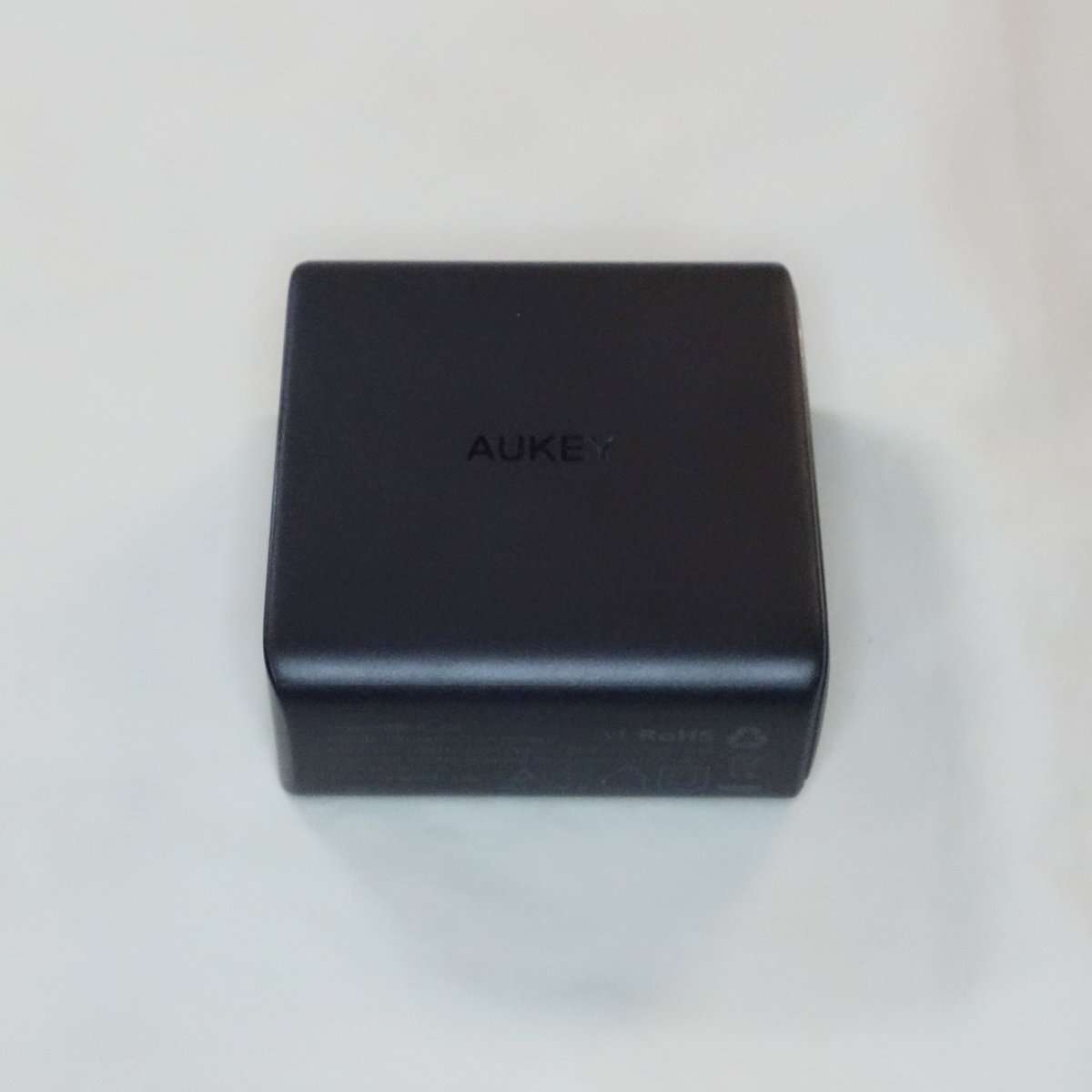 本体はブラックで素材は同じAukeyのモバイルバッテリーと同様のサラサラした素材で、作りも質感もよくAnker などと大差ありません。サイズは67 x 64x 29mmで重量は148gで同じAukeyか2ポート出力でこれより小型のモデルが出ていますが出力は36Wで、こちらはより高出力の63Wのモデルになります。家庭用でUSB-CとPD対応で家やオフィスで使用するなら63Wモデルにして、旅行用などでなるべく軽くコンパクトのにした方は36Wモデルを選ぶとよいかもしれません。