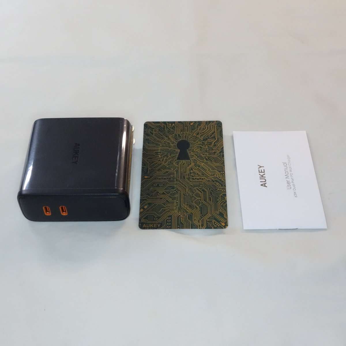 シンプルに入っているのは充電器本体とカード類のみとなりケーブルなどは付属していません。同時に購入したAukeyのモバイルバッテリー10000mAhにはUSB-C – USB-Cケーブルが付属していたので、この充電器と合わせればすぐに充電が可能になります。