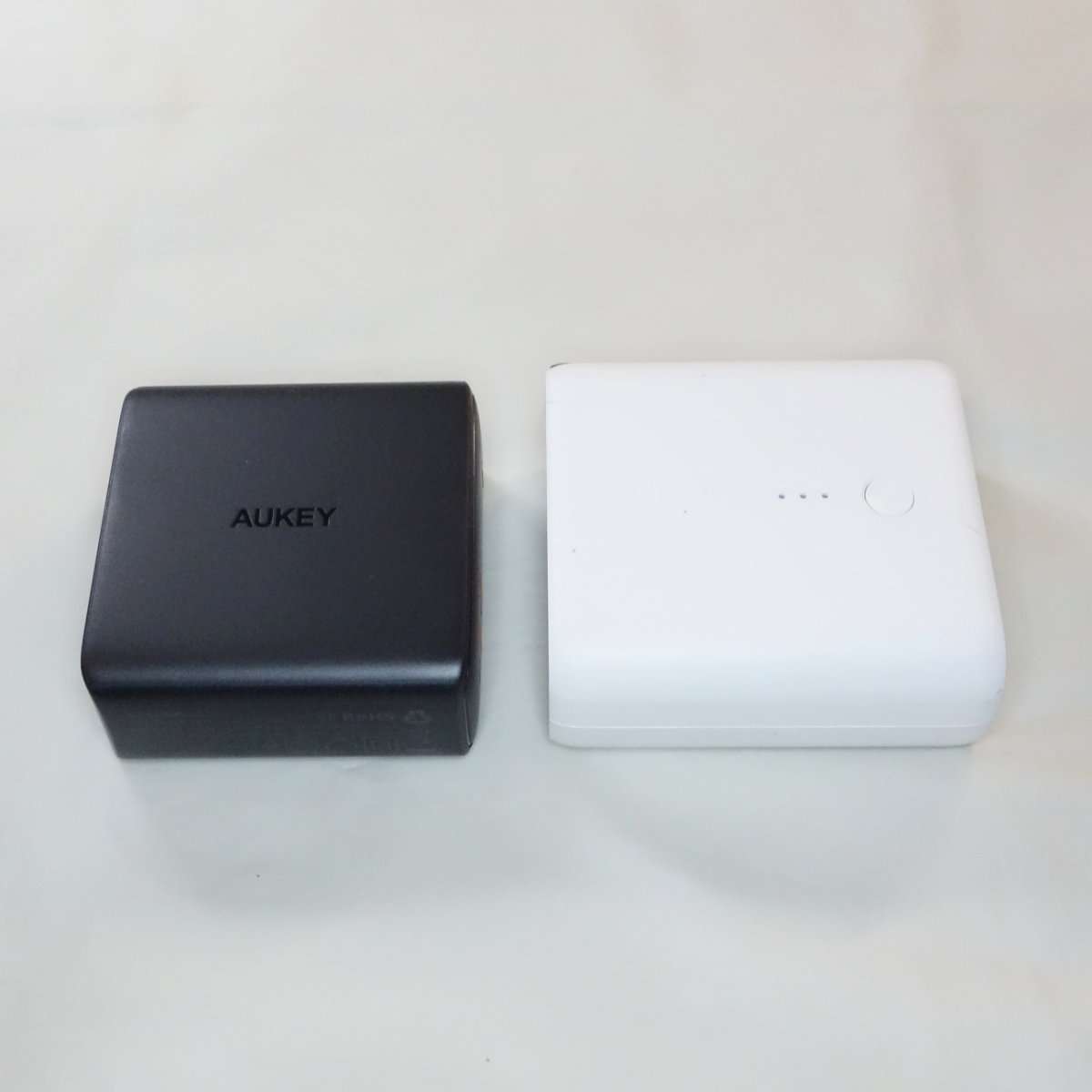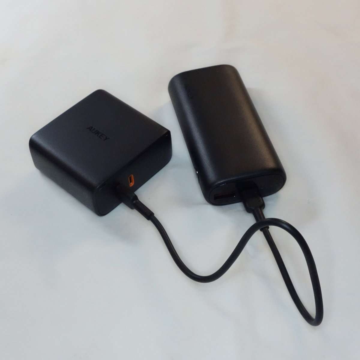 同時に買ったAukeyモバイルバッテリー10000mAhと付属のUSB-C- USB-Cケーブルで接続しました。充電器と同じサラサラな質感のモバイルバッテリーなのでコンビネーションも完璧です。お互いにPD対応なので充電速度も速く、10000mAhの大容量でコンパクトなのでおすすめのモバイルバッテリーです。