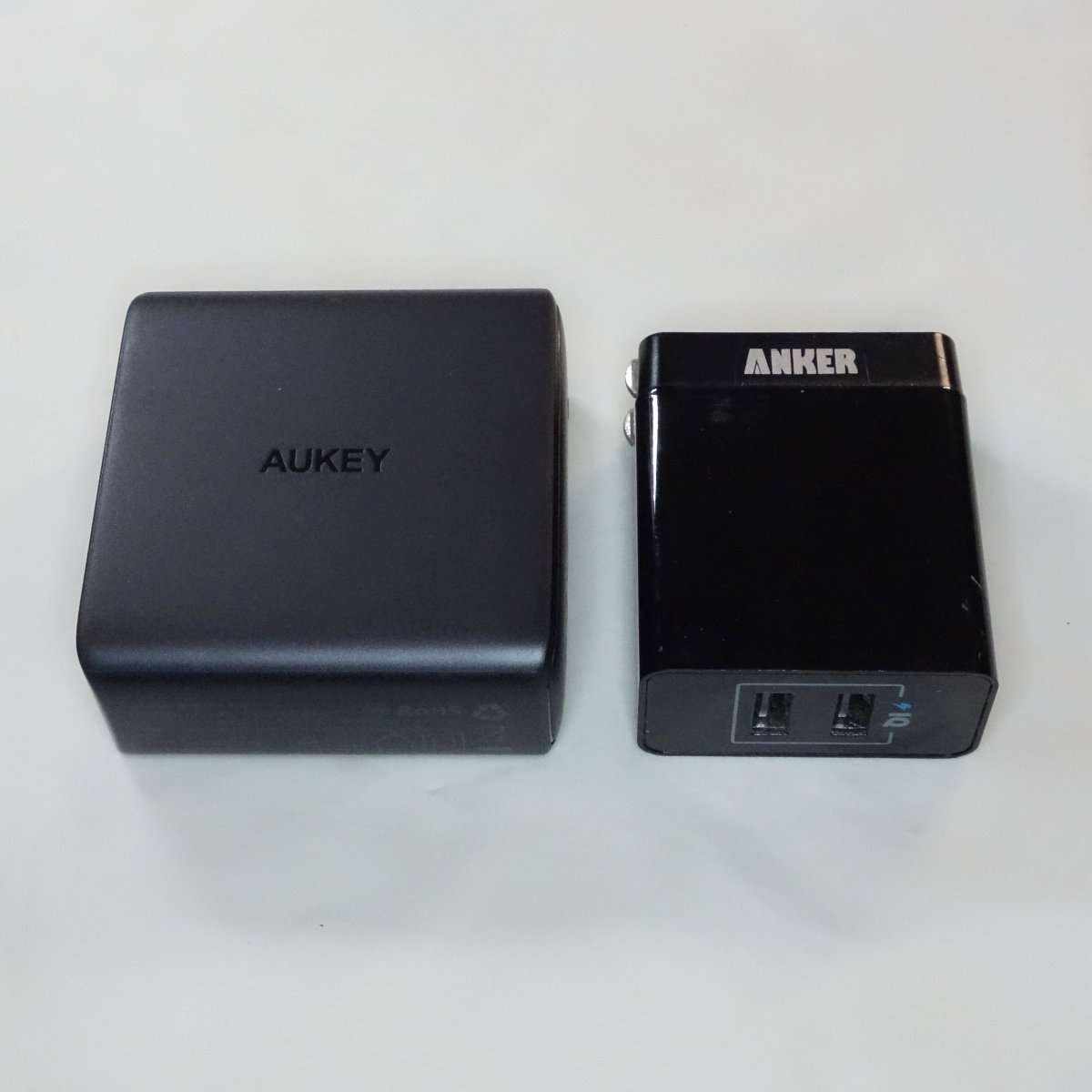 Anker PowerPort 2 Eliteは2ポート合計で24W出力のコンパクトな充電器でこれまでメインに使用していた急速充電器で現在もほ普通に他の機種を接続して使用しています。Aukeyの充電器は63Wの大出力でもAnkerの24Wの充電器より少しだけ大きいだけなのでかなり小型化に力を入れているのを感じます。