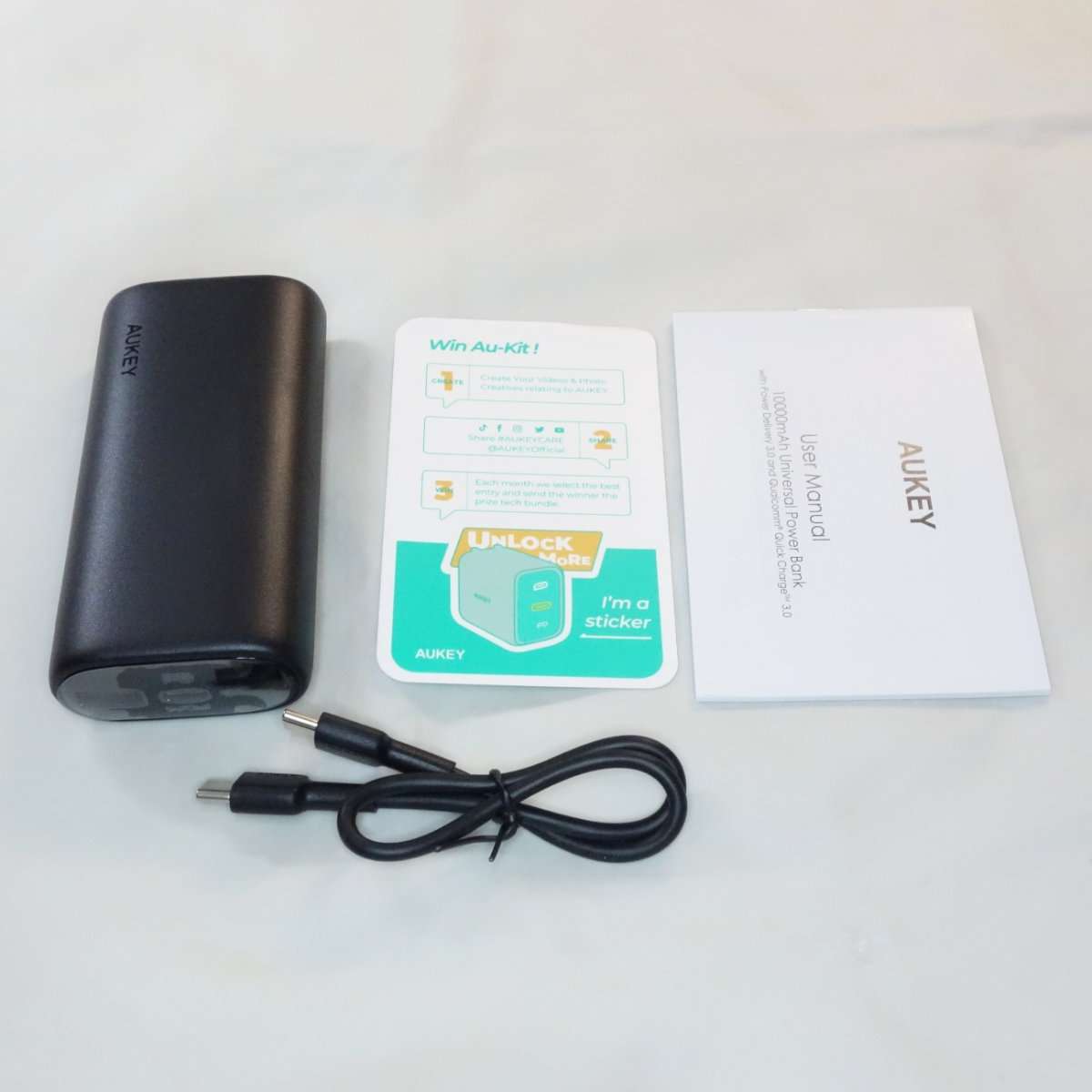 開封すると非常にシンプルに本体とケーブルとカードのみが付属しています。Ankerのモバイルバッテリーはだいたいポーチが付属していましたが、このAukeyのモバイルバッテリーにはポーチは付属せずその分パッケージも小さくなっています。