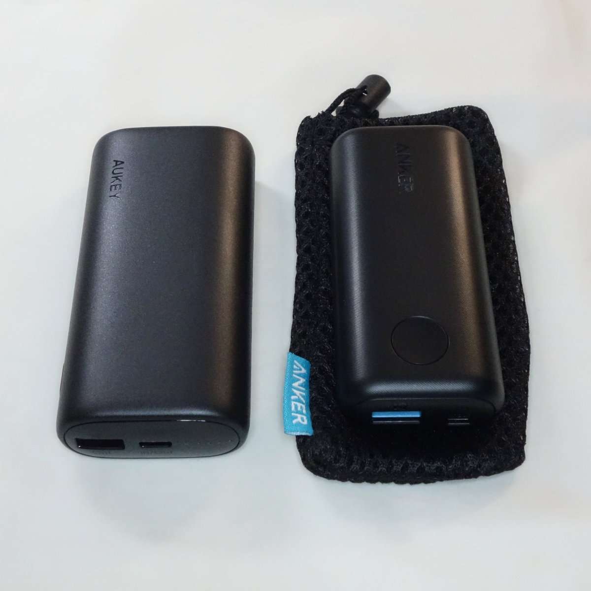 これまで使用していたAnker PowerCore IIと比べると6700mAhのモデルだけに今回のAukeyと比べると小さめですが、10000mAhの容量のモバイルバッテリーとするとAukeyのはかなりコンパクトにまとめられています。