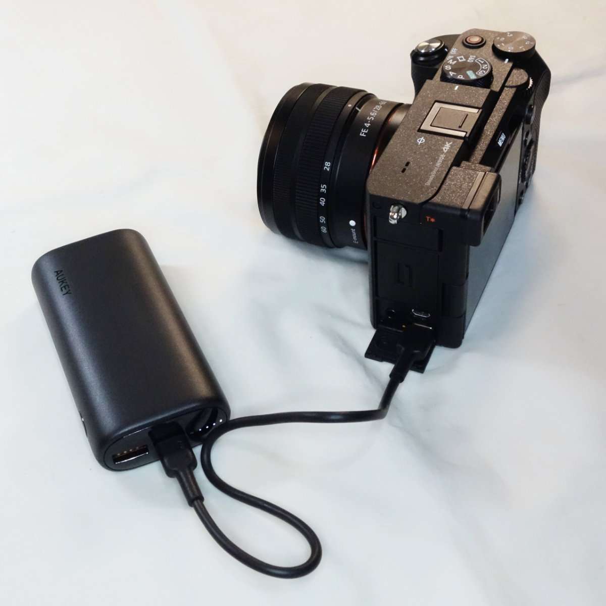 USB-C対応機器の1つとしてソニーa7Cがあるので早速充電するのにAukeyのモバイルバッテリーを接続しました。a7CはPD充電には対応していないので通常の充電スピードになります。a7Cは外部電源を接続した状態で撮影が出来るので、バッテリーを1つ追加するより、大容量のモバイルバッテリーを一緒に持ち運んだ方が出先でスマホも充電できて便利かつ身軽になります。