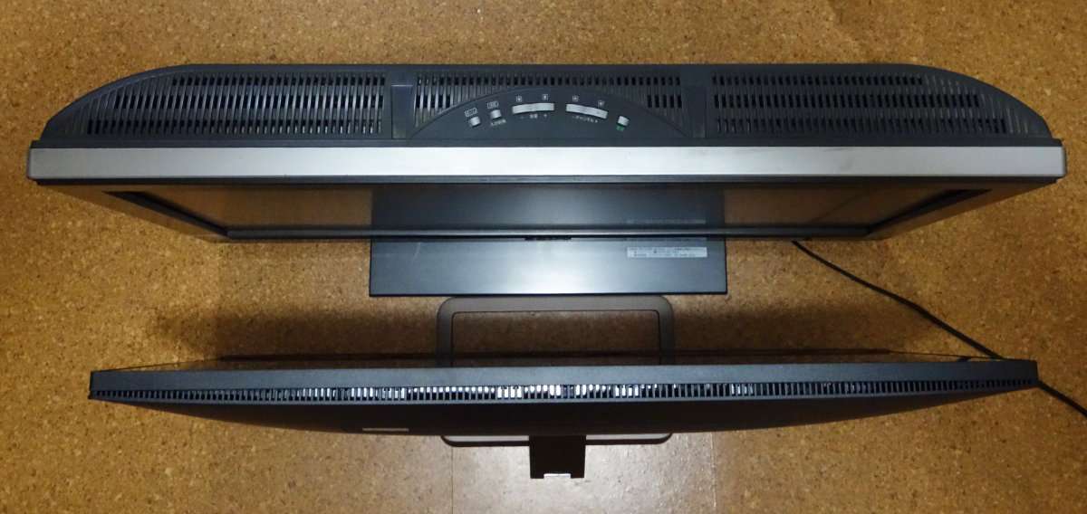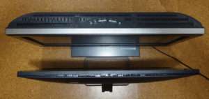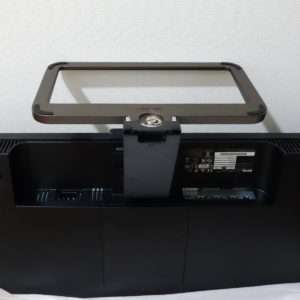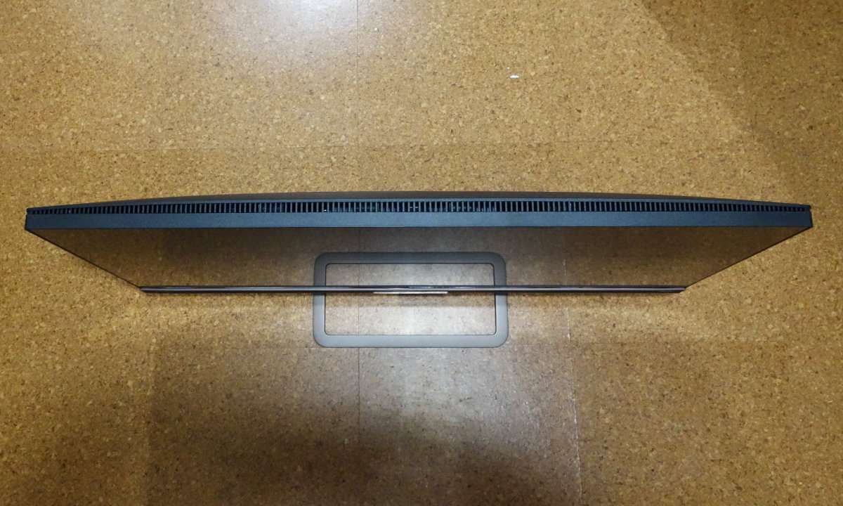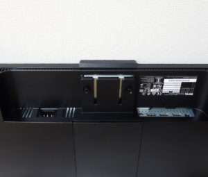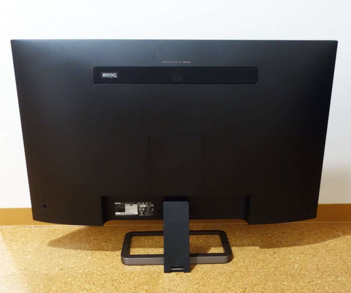 32インチでもベゼルが細いので本体はコンパクトです。液晶の下側はスピカーになっていて液晶後ろの上側にはバスレフポートと思われるメッシュ部分があります。駅諸パネル部分自体は非常に薄く出来ています。液晶パネルはそれほど角度は自由につきませんが通常使用であれば問題ないと思います。