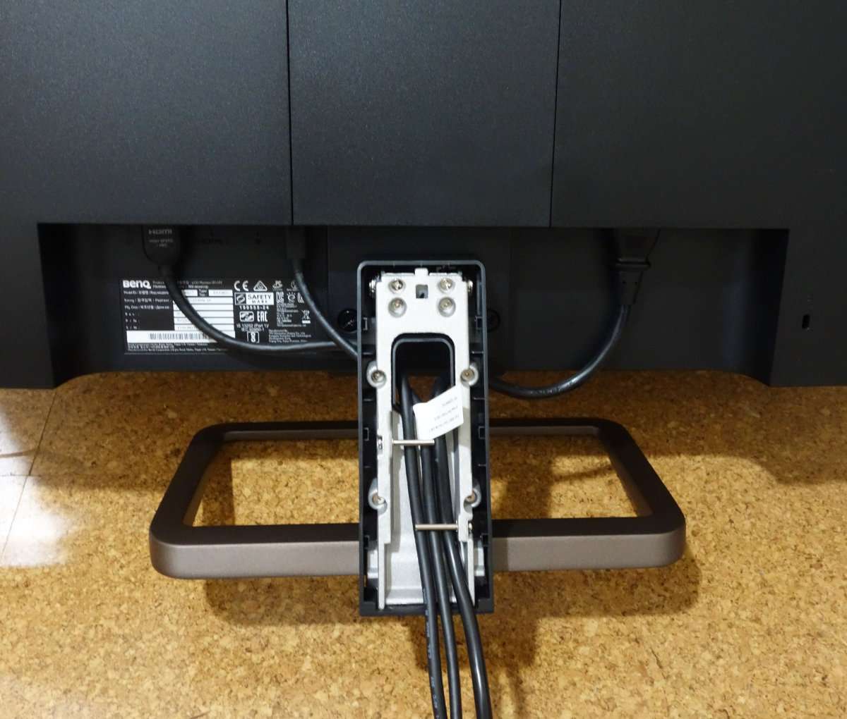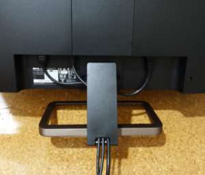 最近のモニターはケーブルを隠せる様になっている品が多くこのモニターも同様です。テレビは設置後にケーブルを取り付けるもの楽ですが、PCモニターはケーブルを接続しにくい場合が多いので先にケーブルを取り付けてしまいます。購入時はPS4しかゲーム機は所有していなかったので、付属のHDMIケーブルは使用せずPS4に付属していた物を使用しました。もう1つのHDMIポートにはAmazon FireStick TVを取り付ける事にして、USB-CはMacBook Proとの接続用に使用します。スタンドにケーブルをまとめる場合は太めの硬いケーブルだと少し入れづらいので液晶画面を傷つけないよう広い場所でケーブルを接続して設置しましょう。