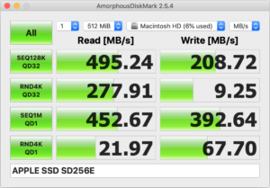 スペック命と言うわけではないですが、外付けのSSDがどれほどのスピードなのか計測してみる事にしました。使用したソフトはMac用のAmorphousDiskMarkになります。Windows用で有名なCrystalDiskMarkと同一の見た目のストレージスピード計測ソフトなのでMac用でディスクのスピード計測がしたい方にはおすすめです。