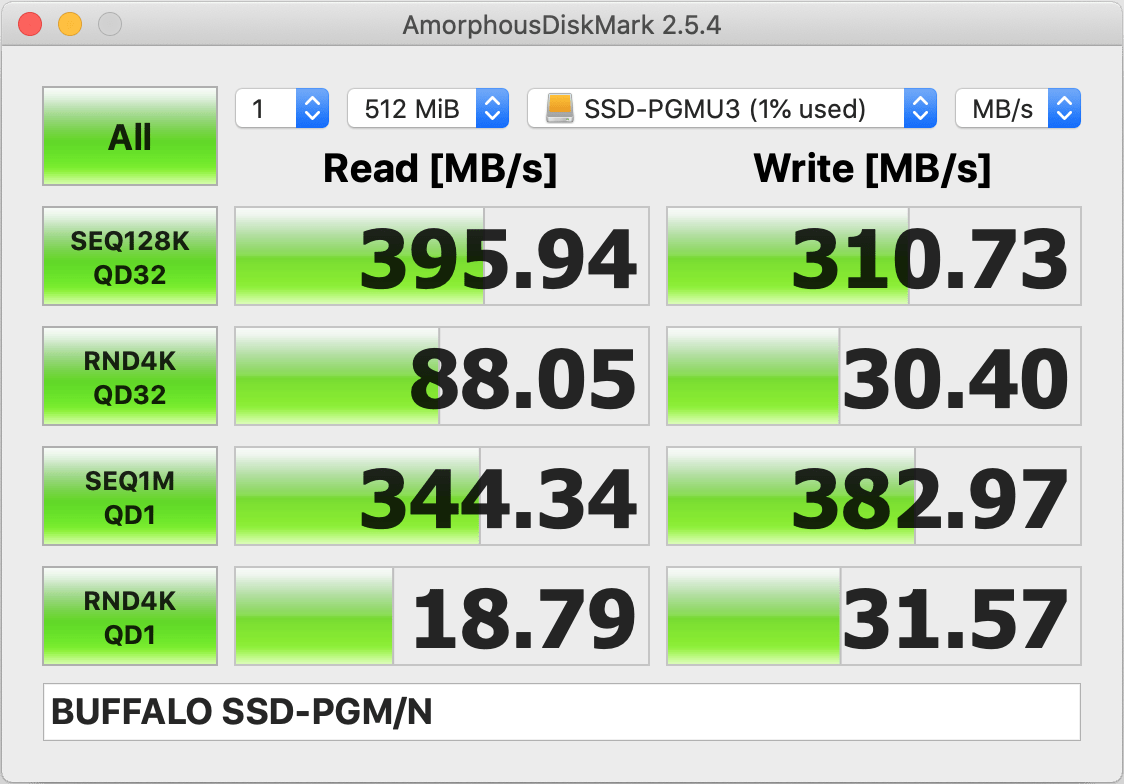 項目にもよりますが外付けにしては相当速いです。所有している機種がUSB3.0まで対応なので本体のUSB3.0と直接とUSB3.0のハブ経由で接続を試してみました。ハブを経由するとかなりスピードが落ちるかと思っていましたが、それほど違いはありませんでした。このBuffaloの外付けSSDはUSB 3.2(Gen 2)対応なので対応のPCなどでUSB Type-Cで接続すると速度が上がる可能性があります。