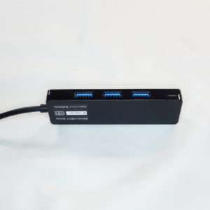 ハブの側面に3つと先端に1つのUSBポートがあり計4ポートになり、どれもブルーのポートなのでUSB3.0となります。新しい規格になる度に使える電力が増えるので、4ポートでもバスパワーで平気でしょう。