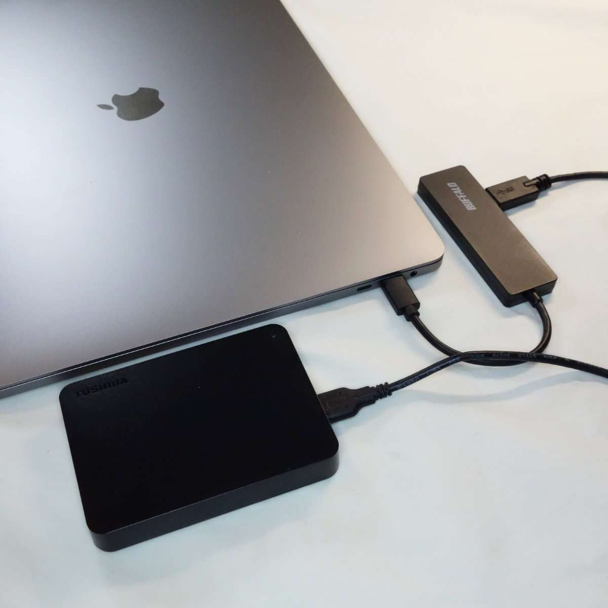 バックアップ用のTimeMachineに使用してる外付けポータブルHDDを接続しました。こちらも自動バックアップ用なので挿しっぱなしにしています。ポータブルHDDには東芝の4TBを使用していて非常に静かで安定しています。