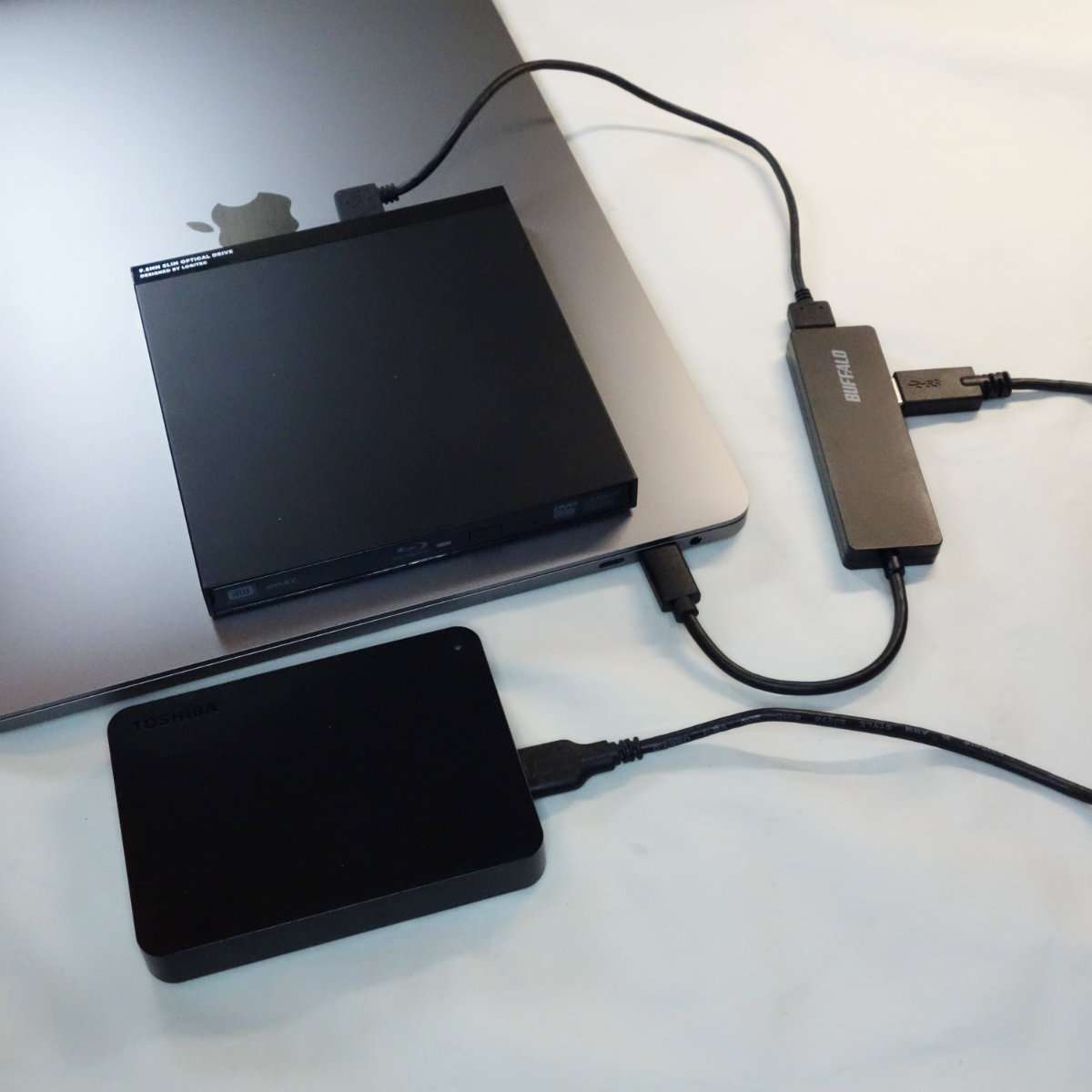 各種ガジェットなどもUSB-Cのみに入れ替えを進めていますが、ドライブ類は今でもUSB Type-Aの端子の物が多いのでどうしてもハブの必要が出てきます。Macで使用可能なロジテックのブルーレイドライブを接続しましたが、ほとんど抜き差しをしないので先端のポートに挿しっぱなしにしています。