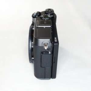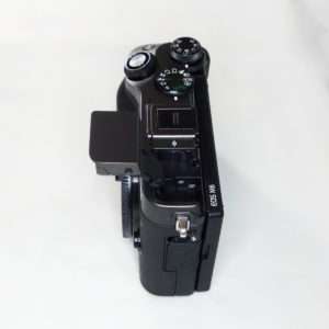 Canon EOS RPには付いていなかったホットシューカバー付きでした。これはEVFが外付けアクセサリーとして用意されていてホットシュー内に接続端子があるためと思われます。