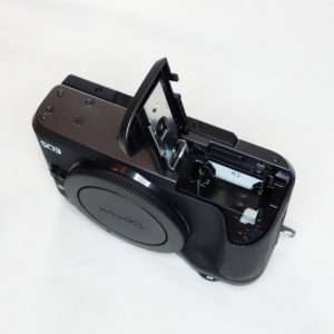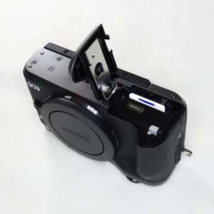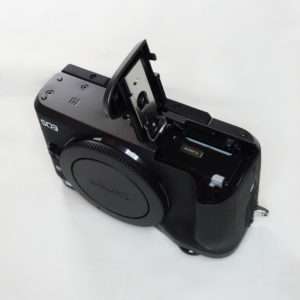 底面のフタを開けてバッテリーを入れます。どのカメラにも言えますが、バッテリーの向きがすぐにわかって、SDカードの向きも合ってすんなり入るカメラは作れないものなのでしょうか。