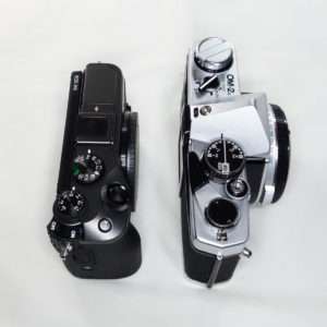 フィルムカメラのオリンパスOM-2Nと比べてみます。APSサイスと言う事もありますが、一回りコンパクトでトップカバーがフラットなのでより小さくみえます。