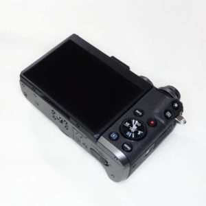 本体を見ていくとファインダーが無いだけにコンパクトでダイヤルなどの質感がよく回した時のクリック感などが心地よいです。ボタン類も他のキャノンのカメラと同じようなレイアウトなのでキャノンのカメラを使用している方は操作に慣れやすいかと思います。