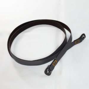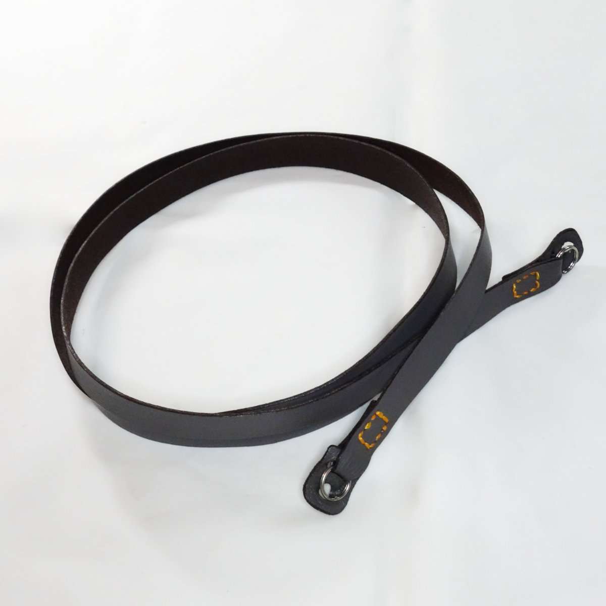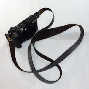レザーを切り出して作ったオリジナルストラップです。こちらはフィルム一眼レフからミラーレスまで合計1kgを切るくらいであれば快適に撮影が出来ます。しかも長さ調整の無駄なパーツがないために軽量です。オリジナルのストラップの良さは自分の体型に合わせて長さを決めて軽量に作れる事でしょう。クライミングロープはカメラに近い部分も太くなるので、カメラに近い手元部分での扱いに関してはレザーストラップの方が快適です。