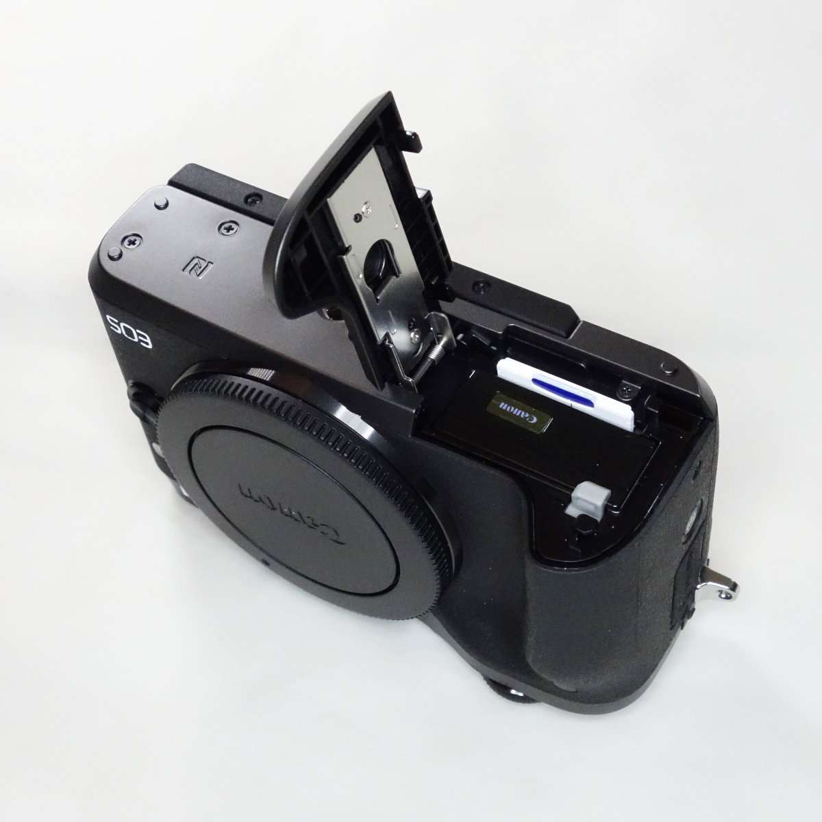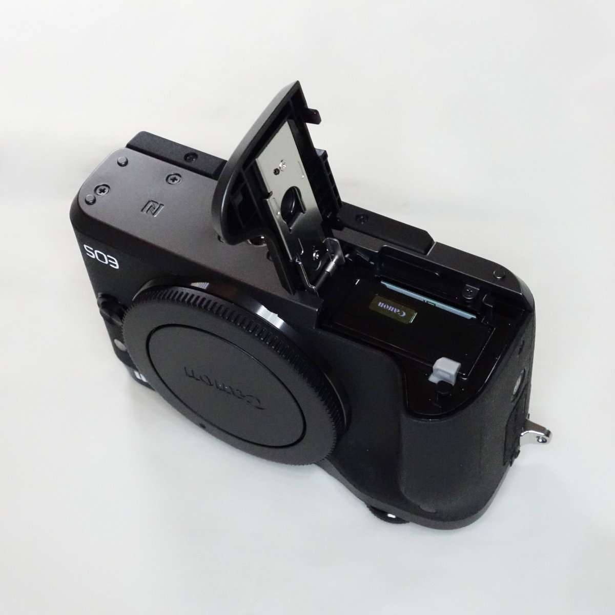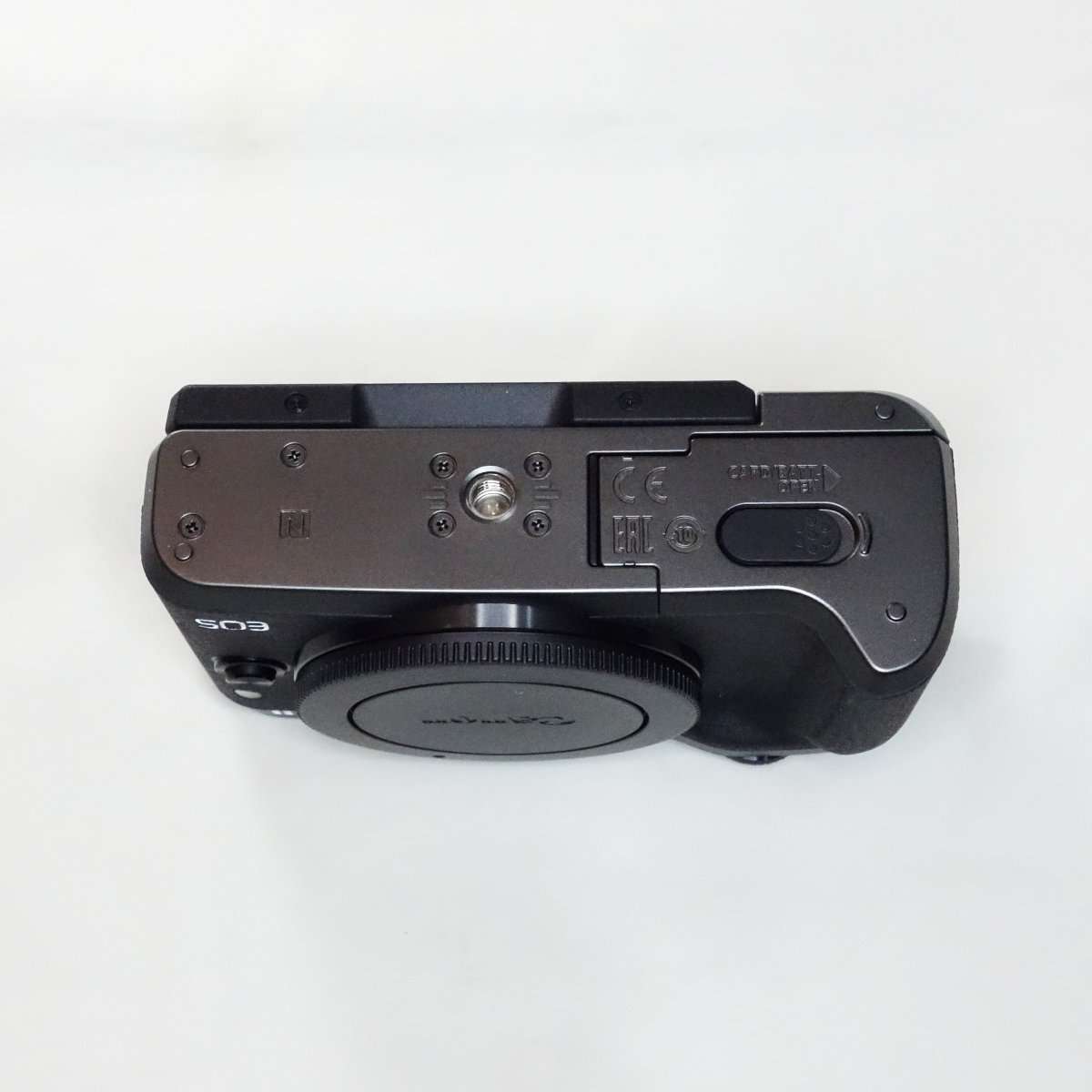 Canon EOS RPには付いていなかったホットシューカバー付きでした。これはEVFが外付けアクセサリーとして用意されていてホットシュー内に接続端子があるためと思われます。