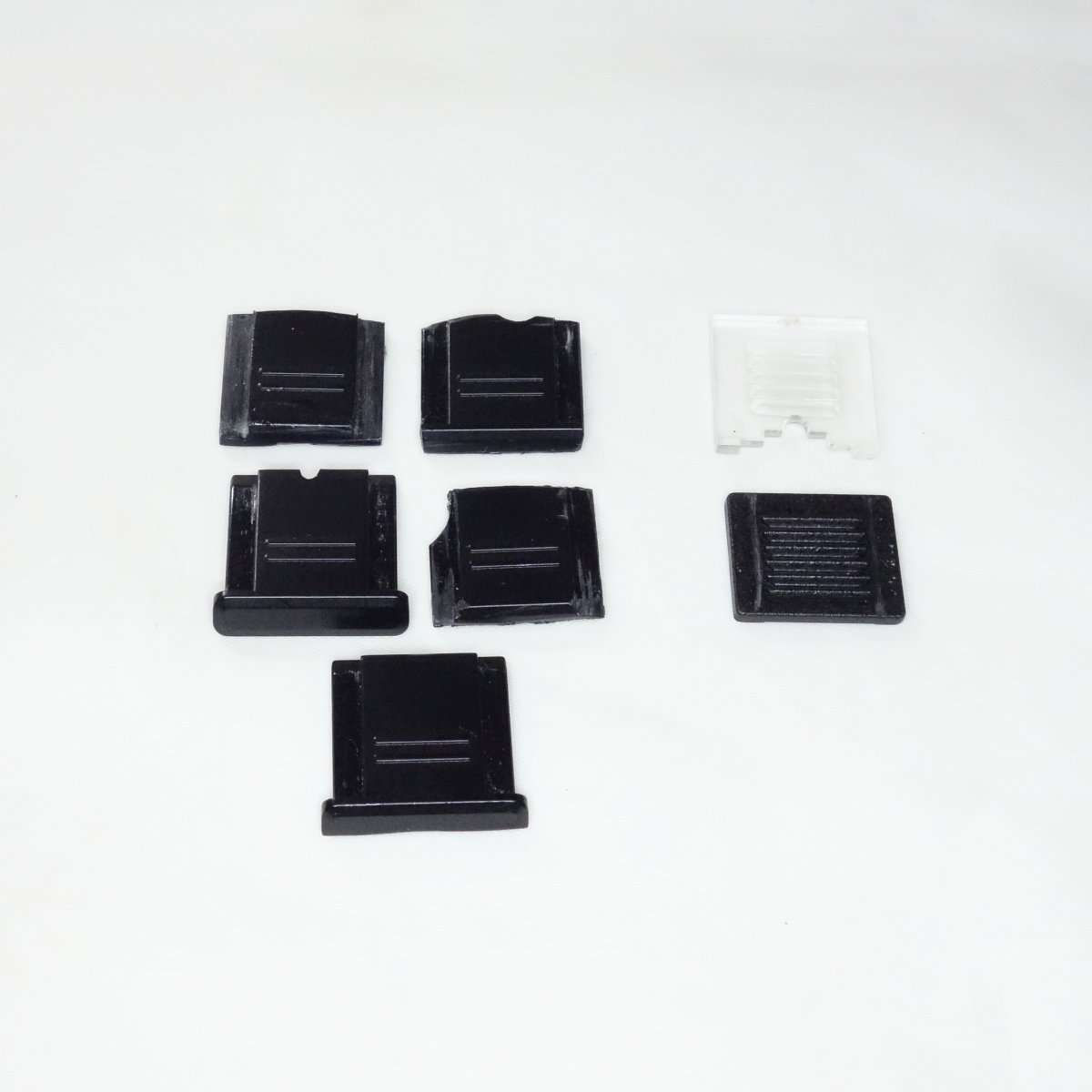 フィルムカメラ時代からの多くのホットシューカバーを使用してきて何用かも覚えてないような物まで多数あったので出してみました。シューズカバーの各部が削られているのは以前はフラッシュが取り付けられた情報をホットシューにあるスイッチでカメラはやり取りしてカバーでホットシューを全て覆ってしまうと常時フラッシュを装着しているとカメラ側で誤認識してしまうからです。フラッシュ取付部なので基本的に形状は一緒で全く刺さらないと言うことはありませんが手前の部分の形状がカメラによって違うのでどれでもぴったりとはまるわけではありません。