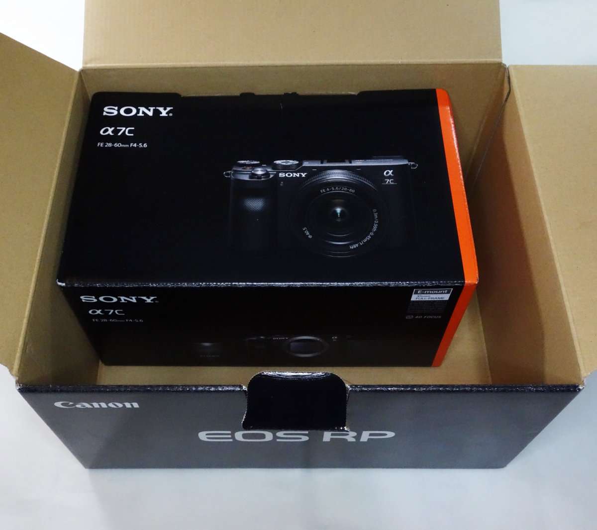 製品をコンパクトにするのが得意なソニーですが、比べると箱もコンパクトです。RPがボディのみの箱とは思えない大きさです。a7Cの箱の中はレンズが入ってしかもプラスチックのトレーなど不使用なので環境への配慮も感じます。Apple製品があれだけパッケージングも含めて進化させて中華製品ですらパッケージングに拘ってコンパクトにしているこの時代にキャノンはお粗末過ぎます。