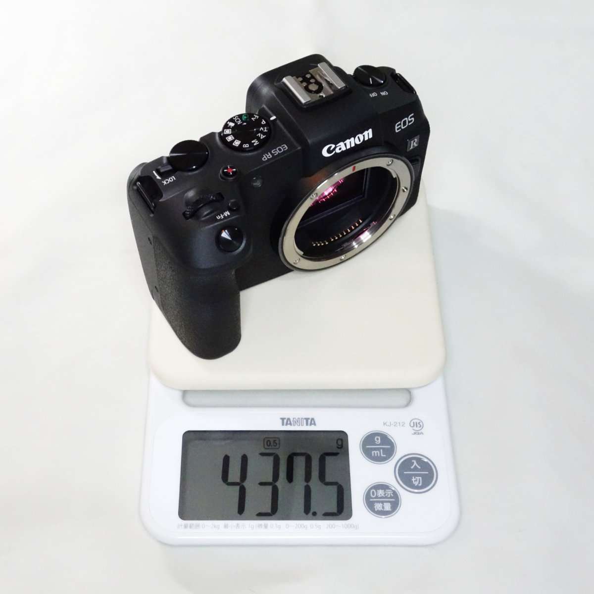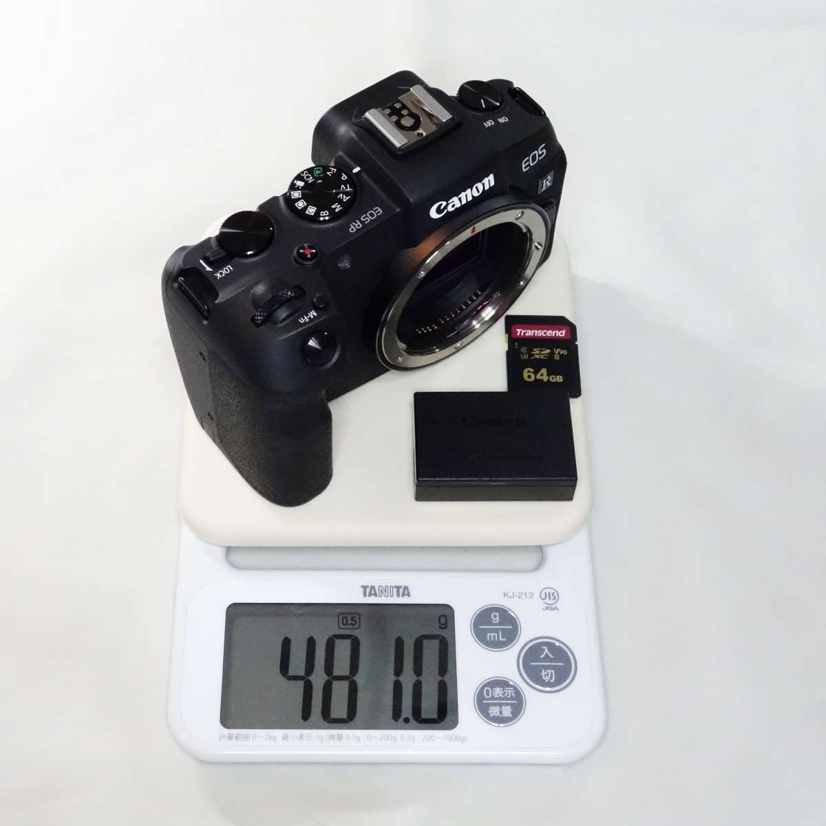 ボディは持っただけでこんなに軽いのかと思えるほどで、レンズ交換式のAPS-CセンサーのミラーレスカメラでもこのEOS RPより重い機種はあります。実際は使用するレンズとのバランスなので重さだけで語れるものでもないですが、ガジェット類は軽くて小さい方がよいのは確かです。バッテリーとSDカードを含めた状態で計測するとカタログ値より少し軽いですが、これは車の幅がカタログより狭いのと一緒で製品の誤差を考慮しての事でしょう。