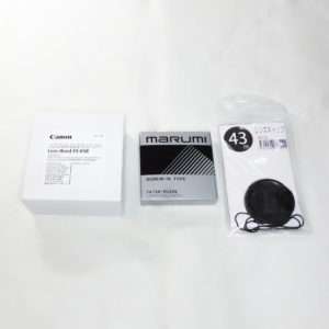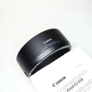 今回購入したのはキャノン純正フードES-65Bです。供給が安定しないカメラ製品でこのフードも品切れが続いていましたが、サードパーティ製の互換フードも出ています。これまでステップアップリングを介して49mmのフィルターを取り付けていたので、フードに合わせて43mm経フィルターとレンズキャップも揃えました。