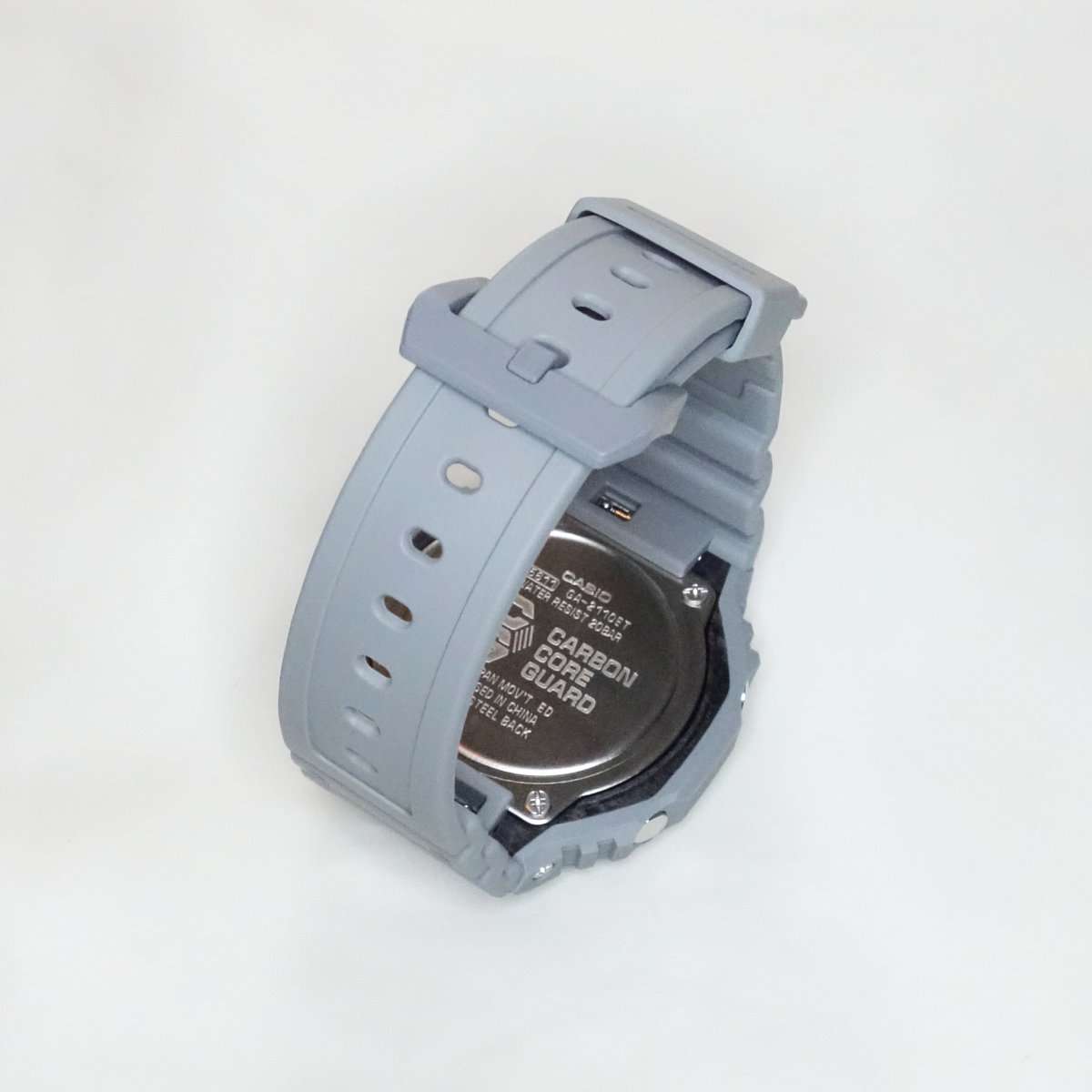 GA-2110ET-8Aは薄めのグレーでまとまってて統一感がます。本体とバンドだけでなく金具(樹脂製)部分も同色でSwatchのようなアプローチで好感が持てます。黒々も格好いいと見せかけて金具とボタンがシルバーなのが残念なポイントです。