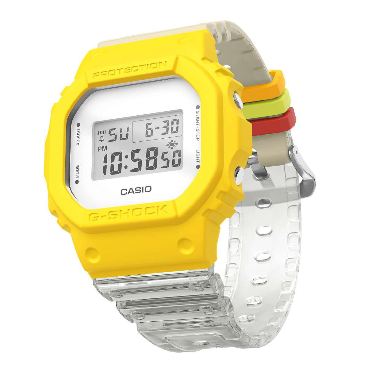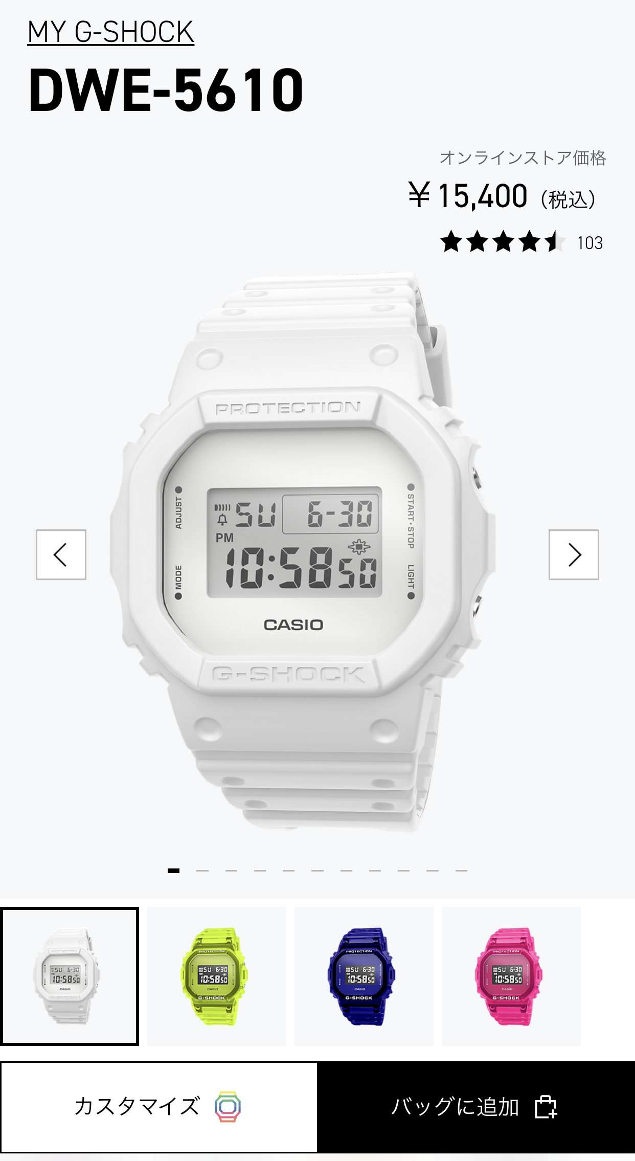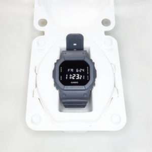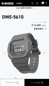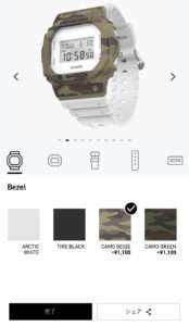 元になる時計はDWE-5610でベーシックなG-SHOCKで電波ソーラーやBluetooth機能は搭載されていません。カスタムでは文字盤、ベゼル、バンド、バンドループ(遊環)、金具などの色違いが選べ組み合わせる事が出来ます。