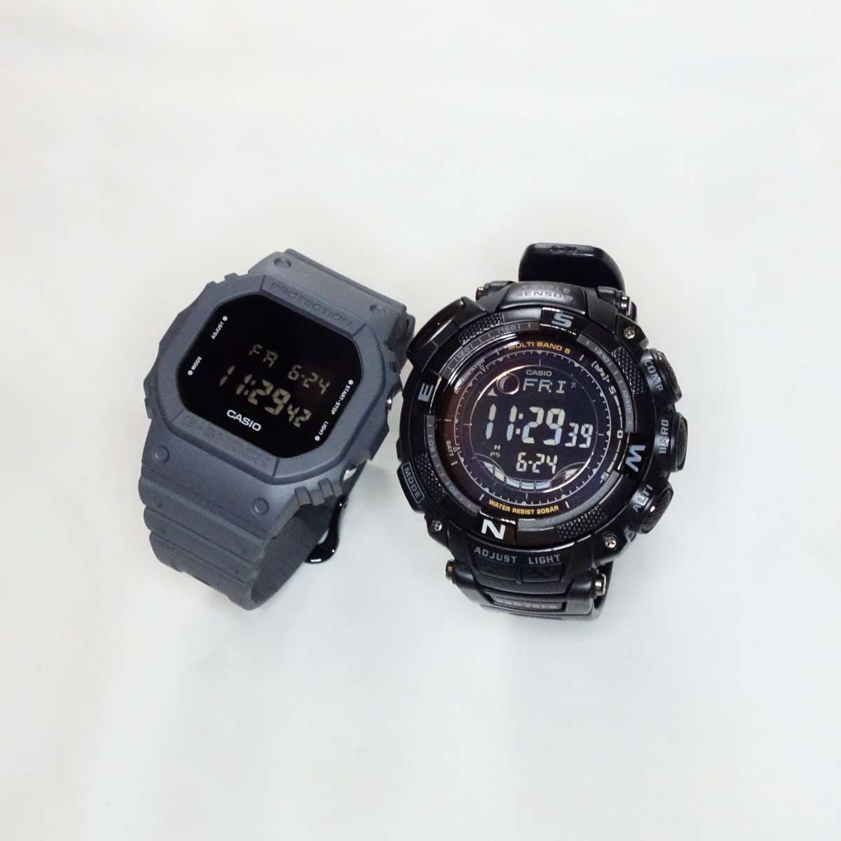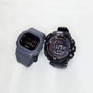 電波ソーラーで各種センサー搭載の最強アウトドアウォッチのPROTREK PRW-1500YJと比べてみます。PRW-1500YJは温度計、高度計や方位磁針などがついているので釣りや山登りに最適で、2カ国の時間を表示出来るので海外旅行でいつも使用しています。