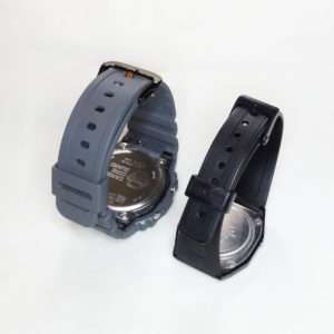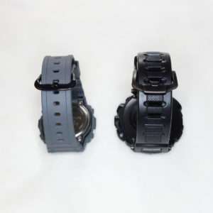 通常でそのままだとバンドの留め具の金具はシルバーのままですが、ゴールドとブラックが選べます。ブラックフェイスの反転液晶にしたので合わせてブラックメタル仕様にしました。カシオの時計は以外とこのメタルパーツの色を合わせてこないので、あと一歩の残念なモデルが多いです。この辺はやはりSwatchなどは攻めていて金具も針もブルーのみで針の読みやすさよりデザインと言うのが海外的です。