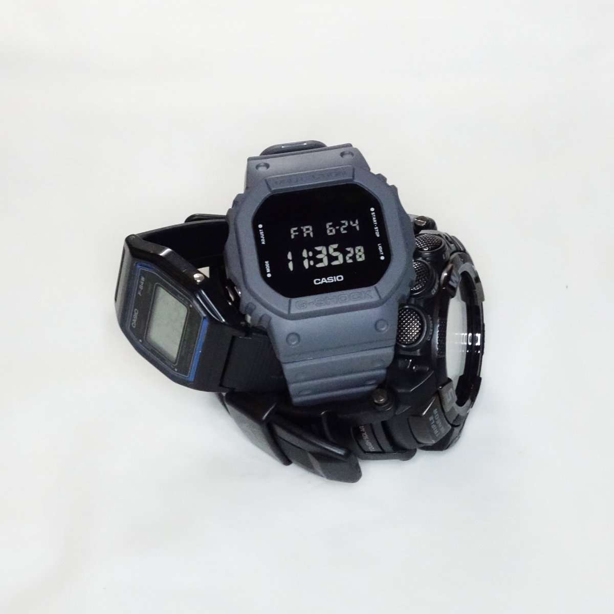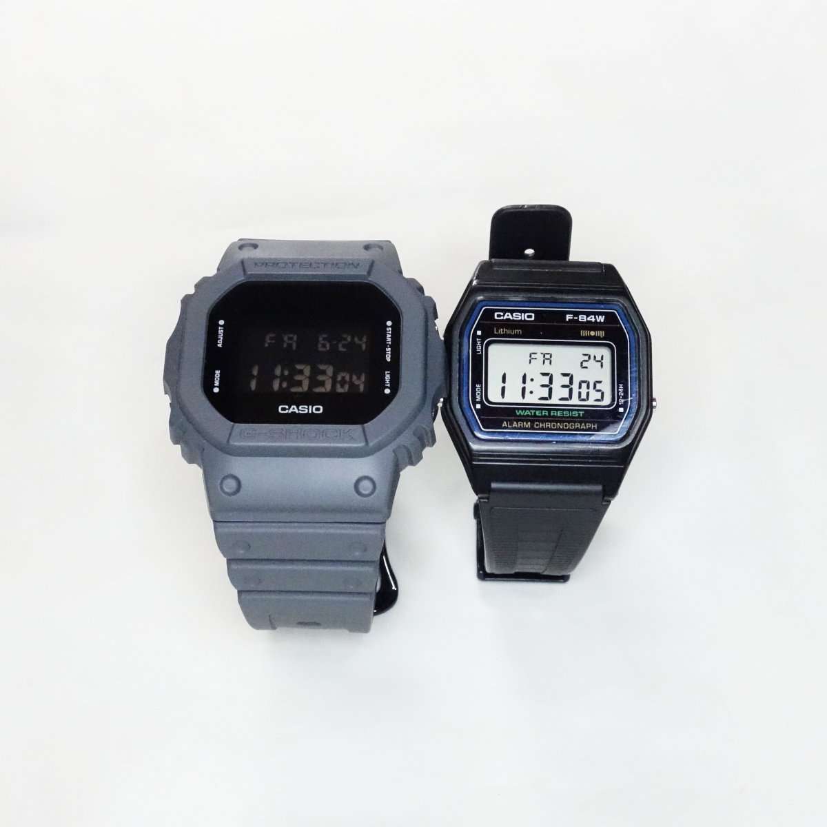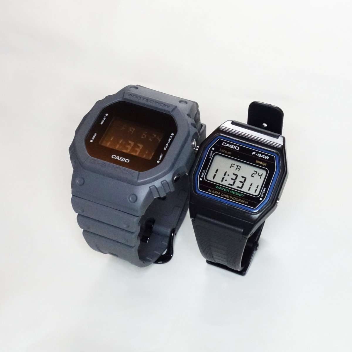 とにかく軽く気軽に使えるチープカシオのF-84Wです。G-SHOCK GWE-5610と比べるとかなり小型で薄いです。特にF-84Wはバンドも細身なのでより小さくみえます。最近使う機会が多かったチープカシオですが、この機会にG-SHOCKへ切り替えていきたいところです。