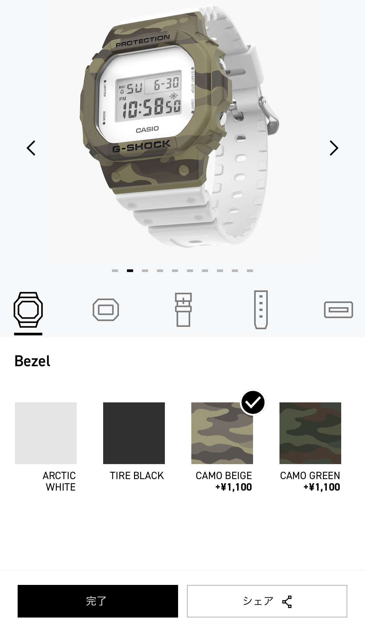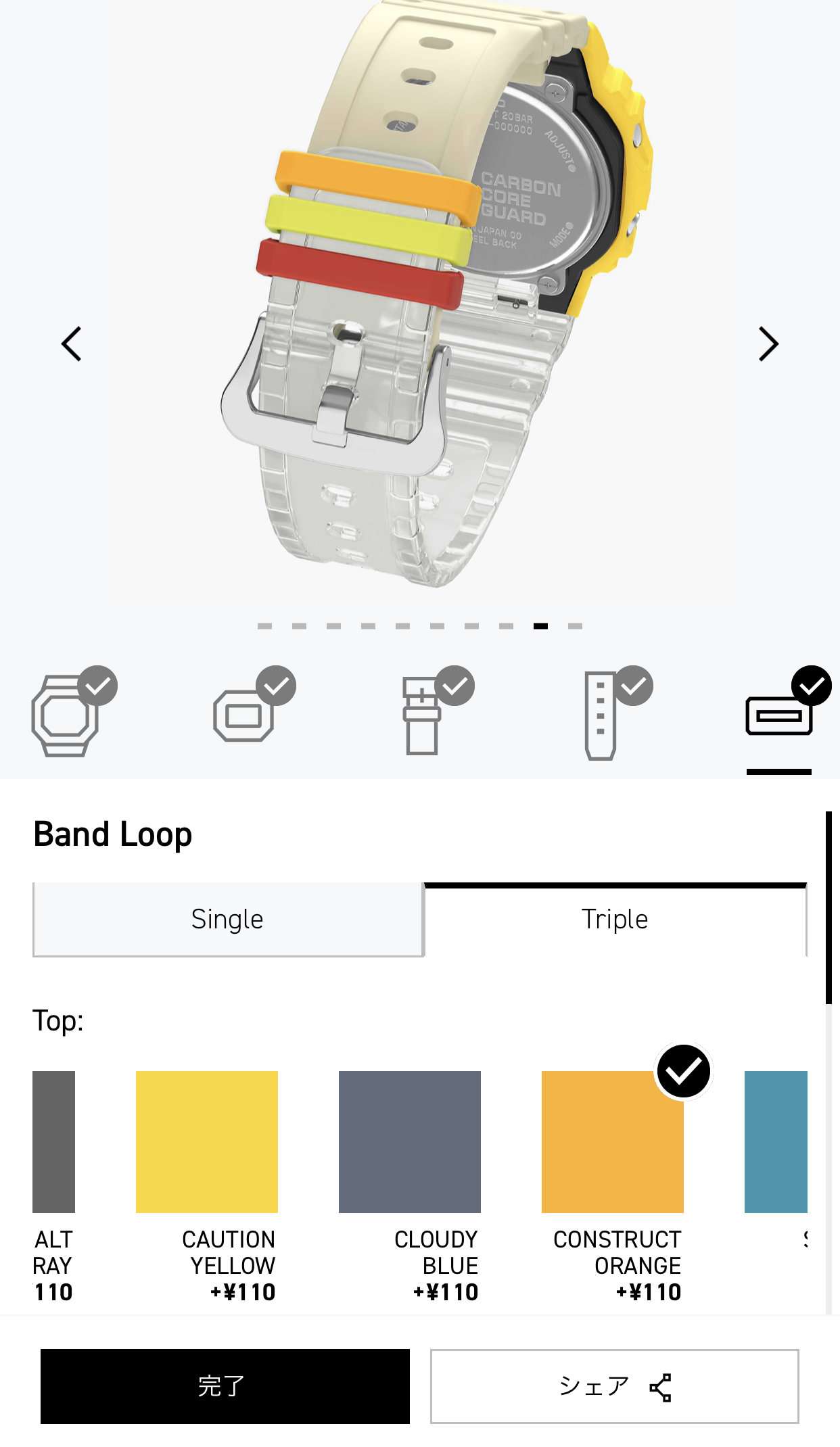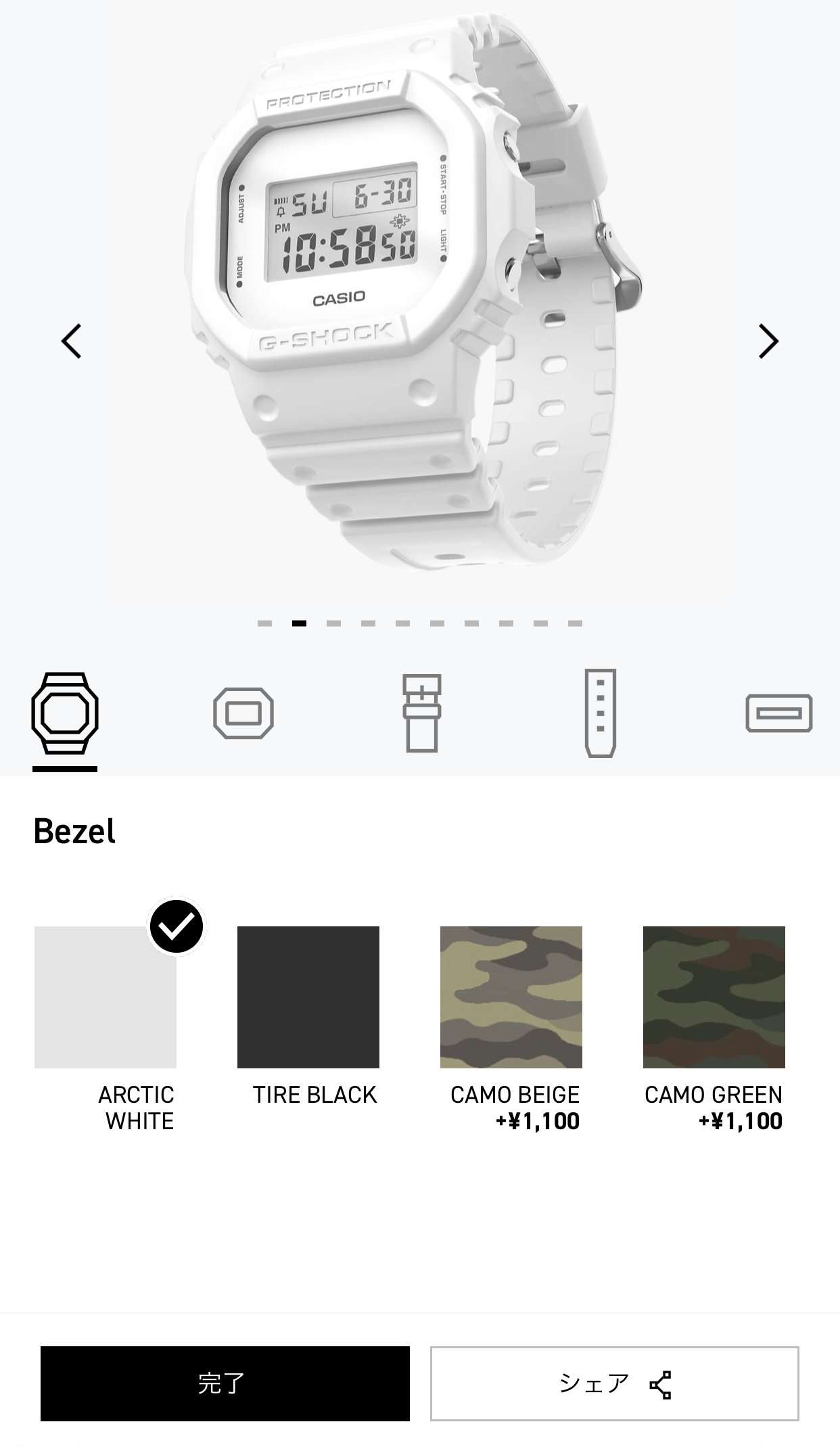 お気に入りのG-SHOCKが出来上がったらブラウザ上にセーブしておく事が出来ます。次回は完成した状態から再度カスタムしたりそのまま注文が可能です。シェアボタンを押すと完成状態の写真を保存する事も出来ます。SNSなどにシェアする時のハッシュタグは#mygshockです。