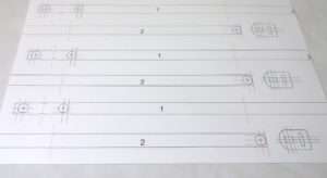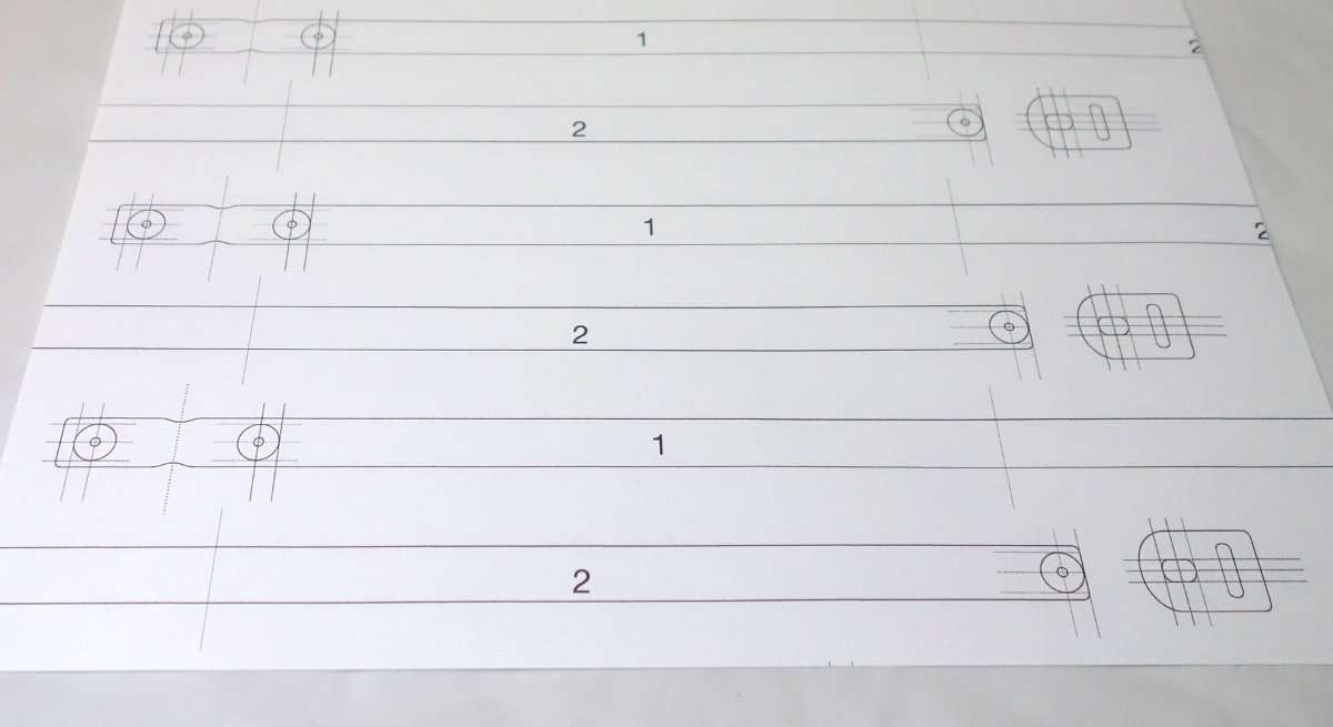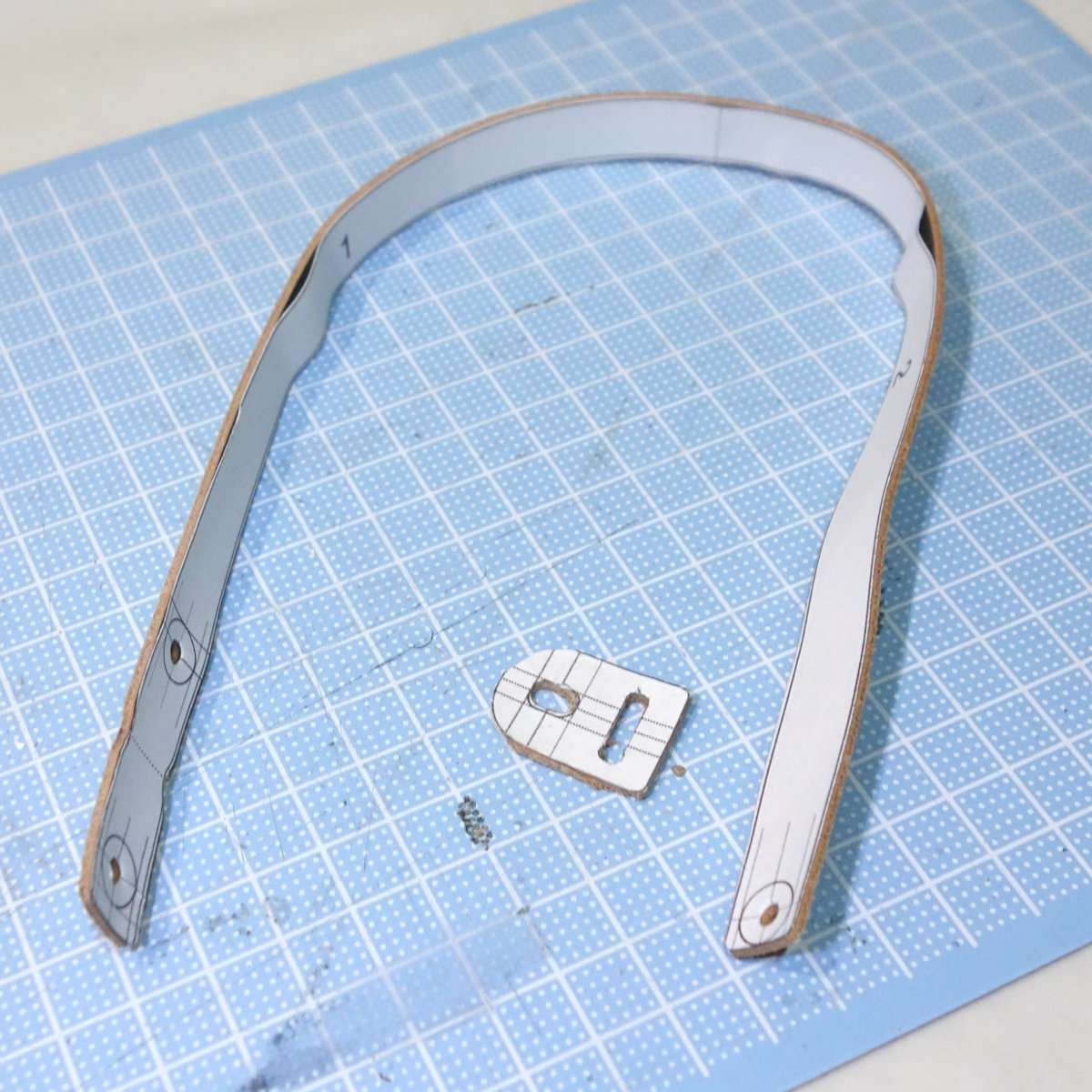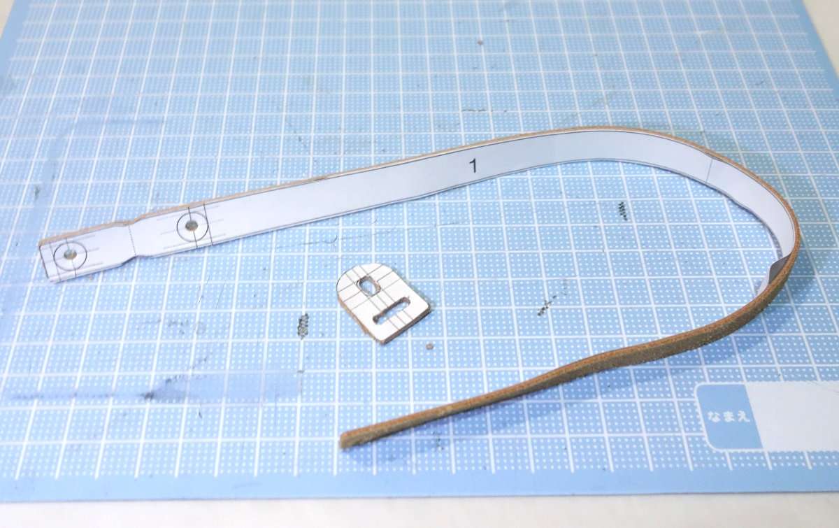 型紙と言っても厚紙に貼り付ける事はせずプリントした紙を直接革に貼り付けます。前回コンピュータで設計図を作ってあるので、ストラップリングガードの部分を若干リファインしほぼそのまま使用します。
