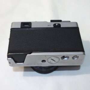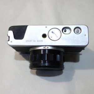 底面の1番右にあるグレーのボタンを押していると強制シャッターを切ることが出来ます。これは何かと言うと35DCのシャッターは1/15以下のシャッタースピードでは切れない仕組みになっており、キャップをつけていたり室内など暗い場所でフィルムを交換する時にシャッターを強制的に切れるようにしてフィルムのコマを進めるための物です。レンズ沈胴の根元にはSEIKOのロゴが見えセイコーのシャッターを使用しているのがわかります。この頃は露出の自動化とシャッターはユニット化されていたので、このセイコーのシャッターかコニカC35などが使用していたコパルのシャッターが多く使われていました。