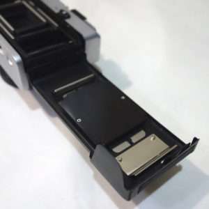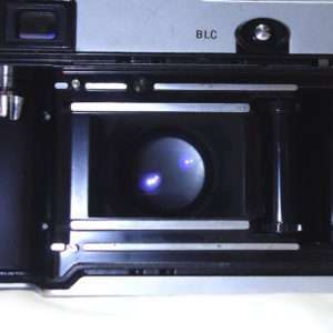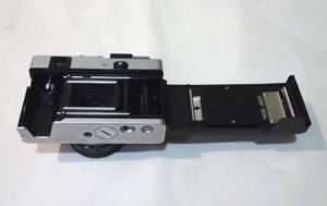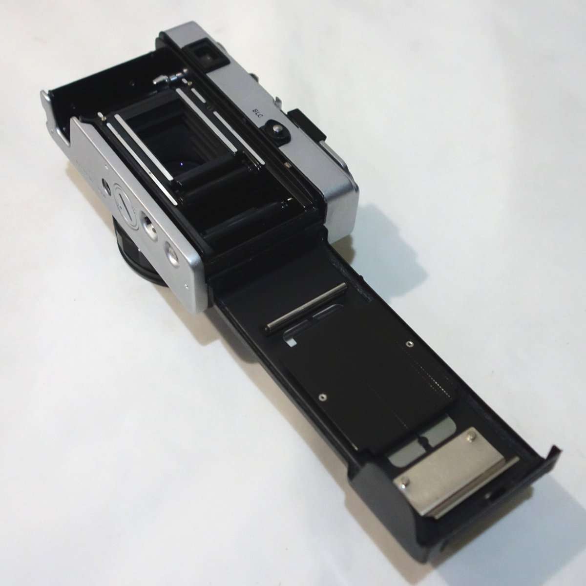 ファインダーの覗き窓の右側にあるシルバーのスイッチはバッテリーチェック用ではなく。BLCと逆光時の露光を2倍にする機能でMinox 35などにある機能と一緒です。裏蓋の開け方が特徴的で、フィルムの巻き戻しレバーを上げるのではなく、底面の左側に見えるレバーを引く事で開ける事が出来ます。底面の1番右に見えるのは強制シャッターボタンです。ISO/ASAの設定はレンズの沈胴の前の方にあり、フォーカスの距離によって回しづらくなるので、その場合はフォーカスをレンズが1番長くなる最短の状態にする必要があります。