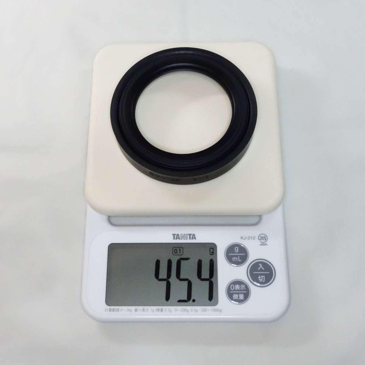 フード単体で重さを計測すると45.4gとZeiss Batis 85mm付属の純正フードが約38gなので若干重めになりますが、これはラバー部分が分厚いのとフィルター枠など金属パーツが使用されてるからかと思われます。