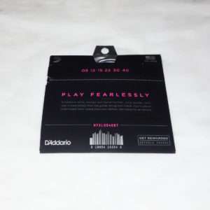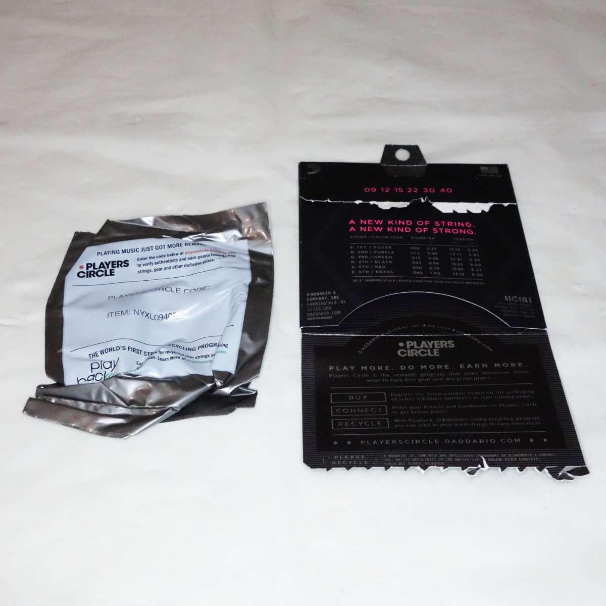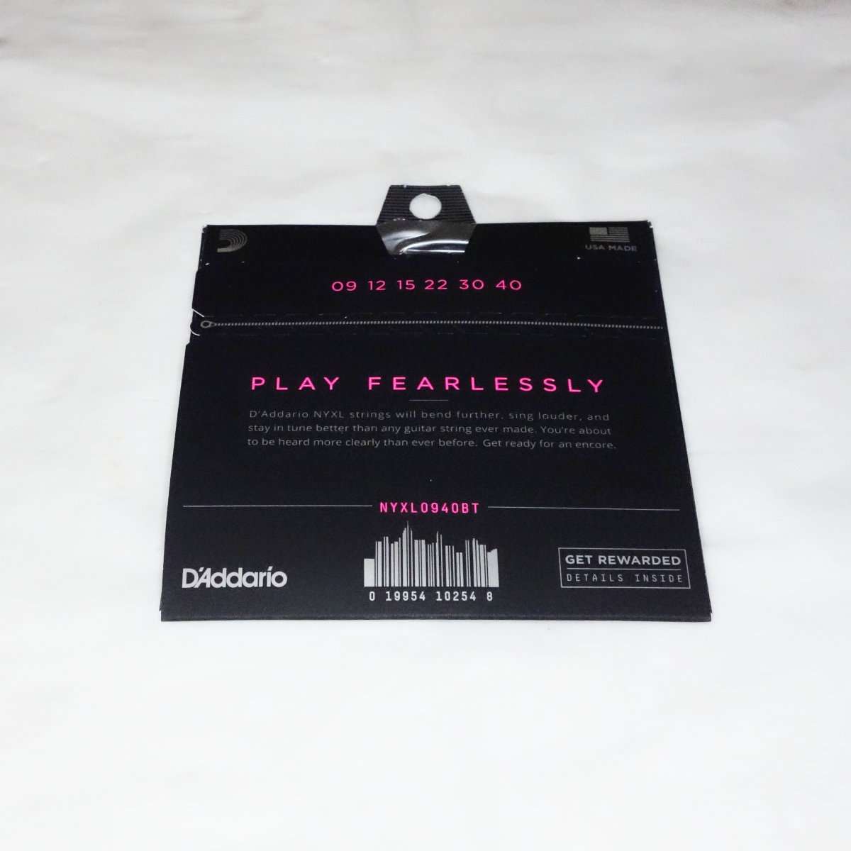 今回使用するのはダダリオのバランスドテンション弦NYXL0940BTでゲージは009-040スーパーライトです。バランスドテンション弦はこれまで慣例的に組み合わせられていた1〜6弦のテンションを数値化した状態でより合わせて、これまで以上に弾きやすくする事を目的にした弦です。バランスドテンション弦自体は以前からEXL120BTなどがあり使用した事がありますが、NYXL弦でもBT弦が出たので使ってみる事にしました。商品名も以前の同じゲージのEXL120BTよりゲージがすぐわかるようにNYXL0940BTとなりよりわかりやすくなりました。