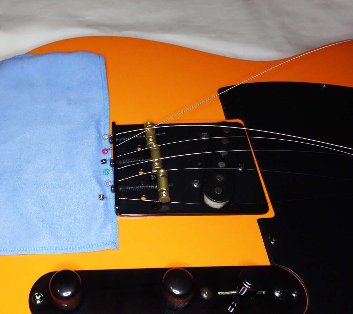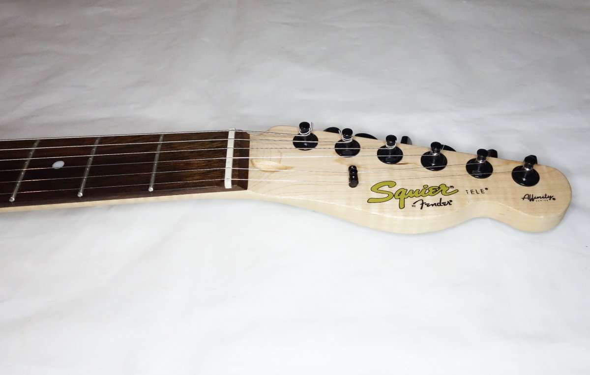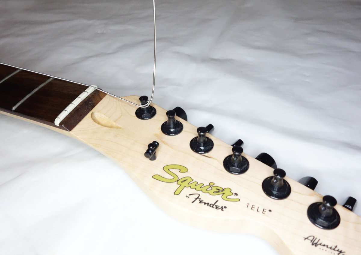 使用するギターはスクワイヤーアフィニティテレキャスターです。ネックが薄いだけでなく幅も狭くとても弾きやすいギターです。スタンダードなままでも音はよいのですが、Fender USAのピックアップに変更して回路を直列ターボ化してあり迫力のある音に改造されています。パーツ類もボディのオレンジに合うように白やシルバーのパーツをブラックに変更してあり見た目も中身も全く変わっています。弦に関してはボディ裏からではなくブリッジに通す表通しなのでよりテンションがゆるく元々弾きづらくはないのですが、これをより楽に弾けるようにしていきます。