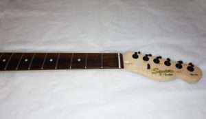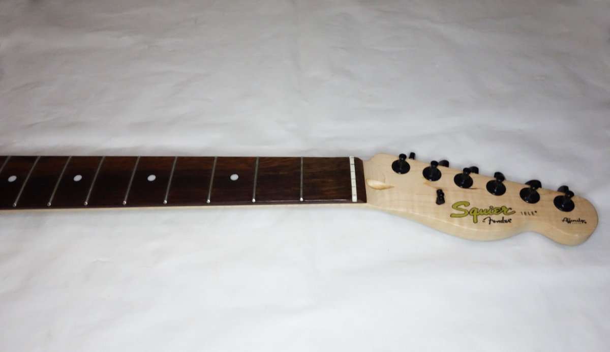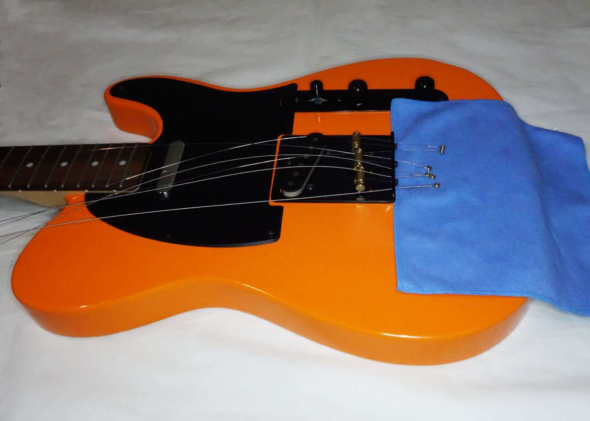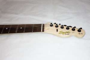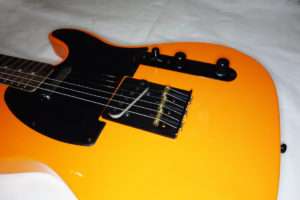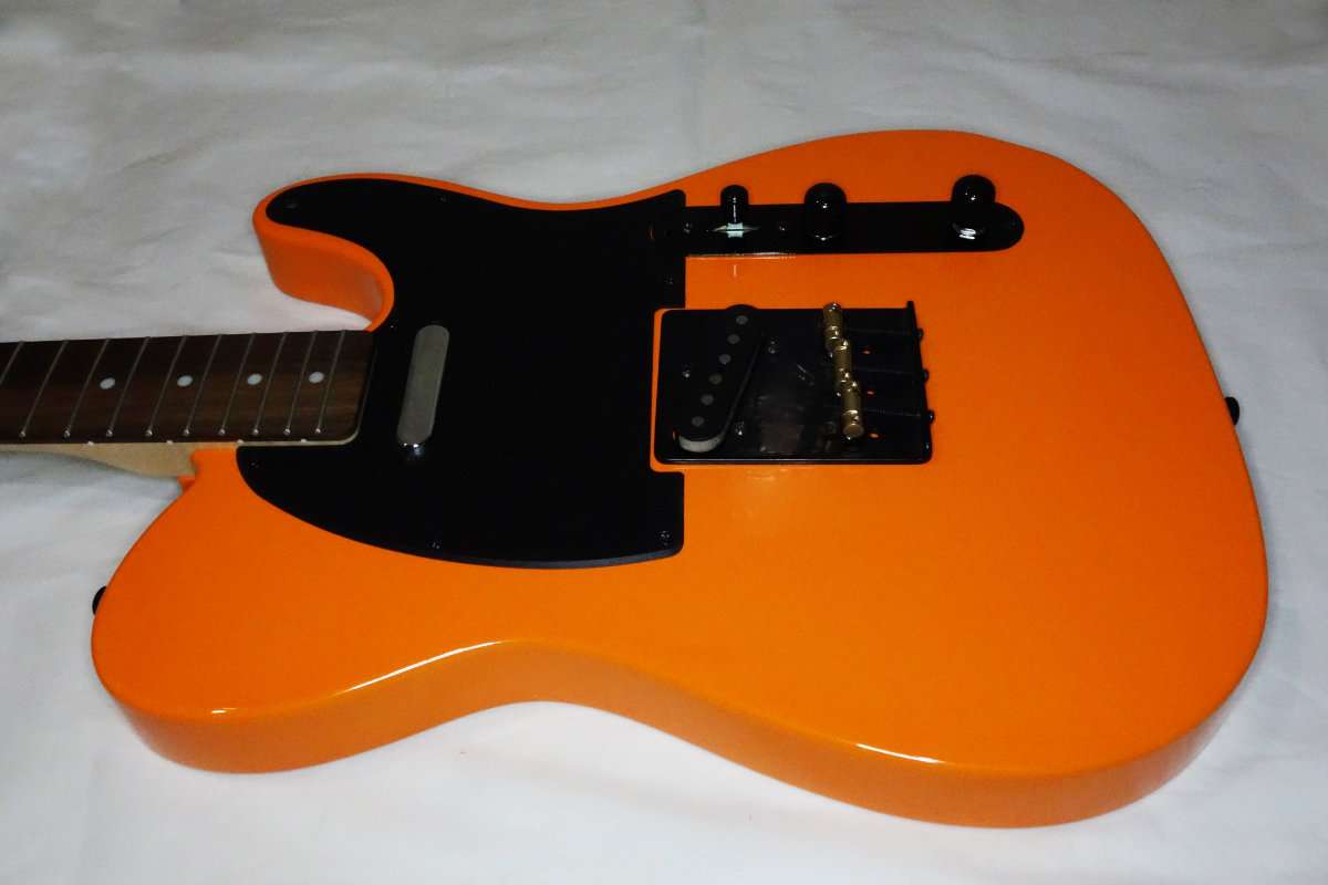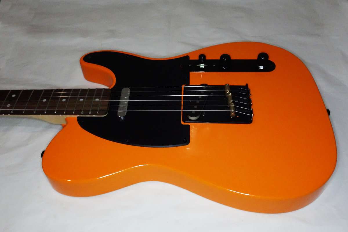 使用するギターはスクワイヤーアフィニティテレキャスターです。ネックが薄いだけでなく幅も狭くとても弾きやすいギターです。スタンダードなままでも音はよいのですが、Fender USAのピックアップに変更して回路を直列ターボ化してあり迫力のある音に改造されています。パーツ類もボディのオレンジに合うように白やシルバーのパーツをブラックに変更してあり見た目も中身も全く変わっています。弦に関してはボディ裏からではなくブリッジに通す表通しなのでよりテンションがゆるく元々弾きづらくはないのですが、これをより楽に弾けるようにしていきます。