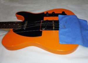 ギターの弦交換の時は最高のクリーニングのタイミングなのでこの機会にギター全体を綺麗にしてしまいます。ホコリやゴミが付いたまま擦るとボディを傷つけてしまうので、カメラ用のブロワーなどでブリッジにつまったホコリなどを飛ばします。ホコリを飛ばしたらボディをタートルワックスで磨きます。ワックスが乾いたら専用のマイクロファイバークロスなどで乾拭きをしましょう。