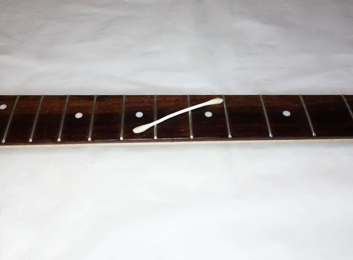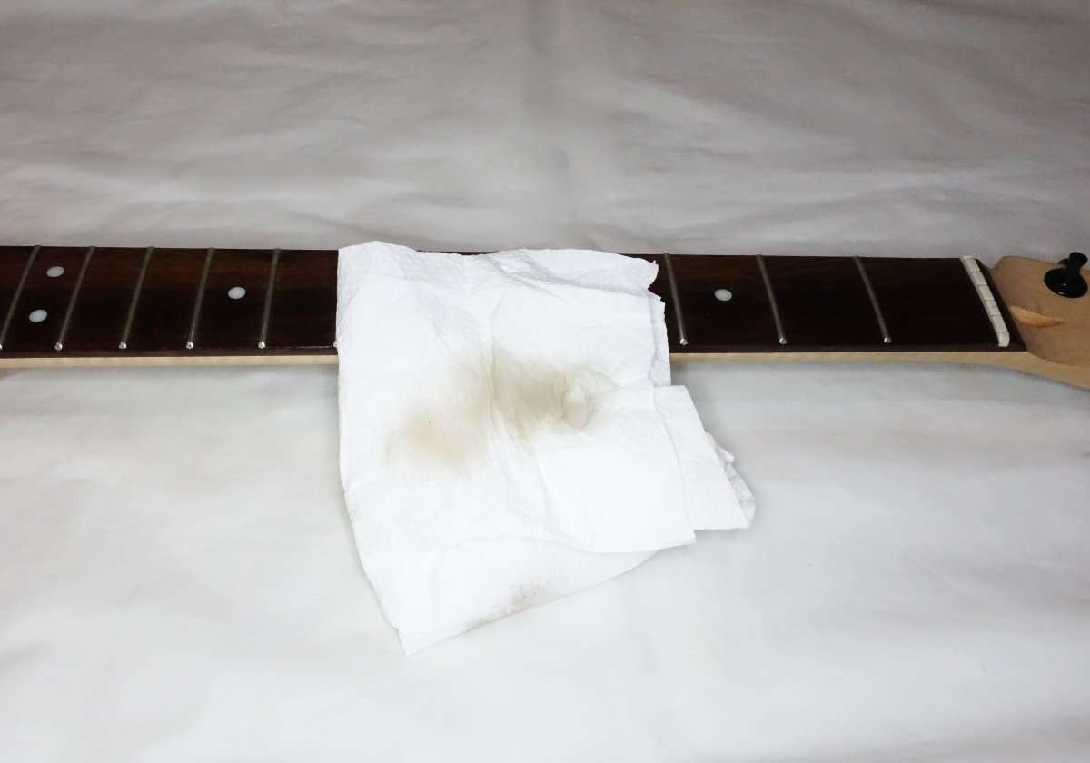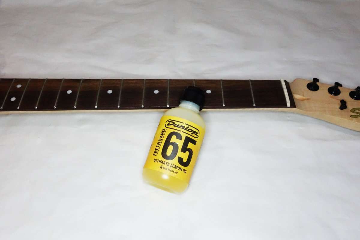 弦が張られてないので指板をクリーニングするには最適なタイミングです。テレキャスターの指板は(前期型のみ)ローズウッドなので、クリーニングにはジムダンロップのレモンオイルを使用します。ボトルの先端が布状になっていて直接塗れるのですが、すぐ汚れてしまうのでコットンパフやキッチンペーパーを使用して指板全体をフレット横の細かい部分は綿棒で磨きます。塗り過ぎはよくないので塗り終わったら乾拭きをして余計なレモンオイルを拭き取ります。