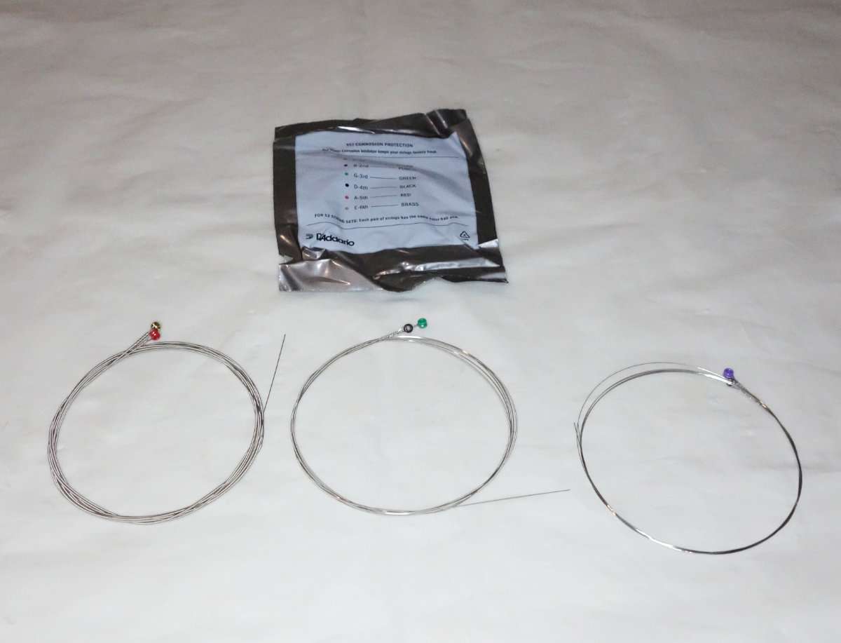 これまで張っていたエリクサーをそのままはずします。いきなり古い弦を真ん中から切ってしまうのもよいですが、新しく張る弦がサビやボールエンドのほつれなど不良品ではない事が確認出来るまでは古い弦を保管しておいた方が安全です。