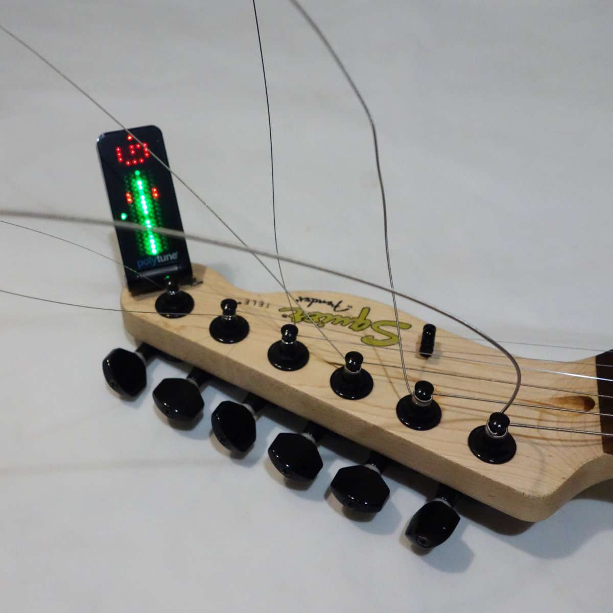 全ての弦を張ったらチューニングをします。チューナーはTC Electronic PolyTuneがチューニング精度も高くクリップチューナーでは最高のクオリティです。弦を張りたての状態だとチューニングが安定しないので、指板の上の弦を何度が持ち上げてテンションをかけて緩みを取ると安定するまでの時間が短くなります。