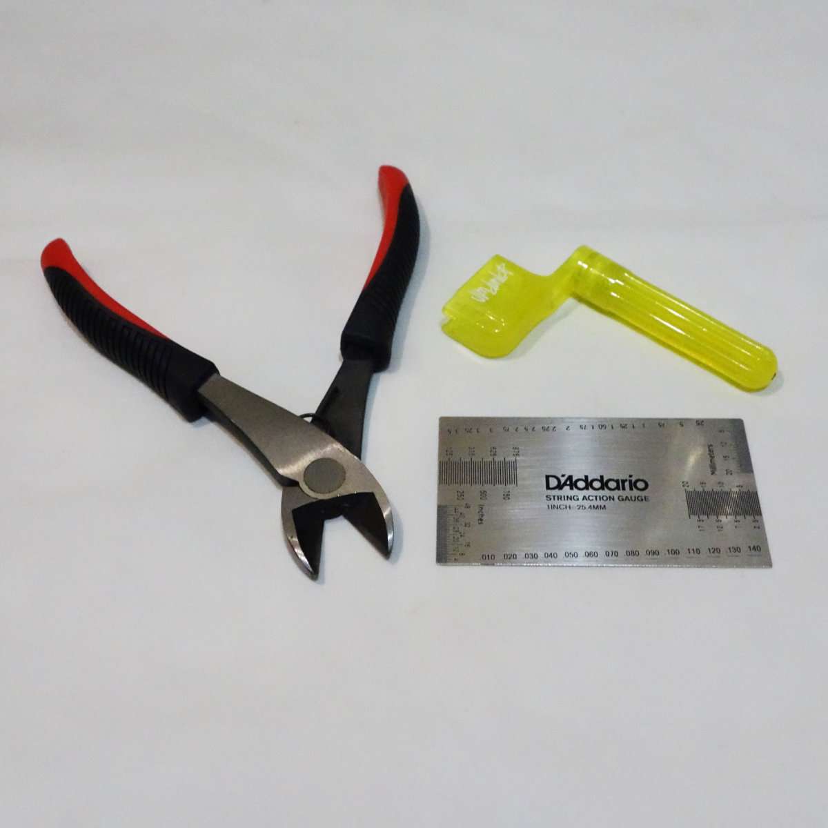 弦交換に必要な工具は弦を切るストリングカッター、巻き取るストリングワインダーです。カッターは小型のニッパーではなく専用のものを用意しましょう。ストリングワインダーはなくても弦の交換は出来ますがあると便利です。弦高を測る場合はストリングアクションゲージ(ストリングハイトゲージ)を使用します。